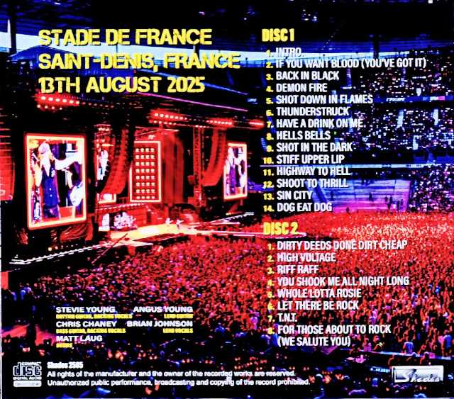AC/DC, who have been performing for over 50 years and continue to captivate audiences worldwide, are releasing two original IEM albums simultaneously, allowing you to experience their latest “PWR/UP Tour”! These two albums were recorded at two consecutive shows held at the same venue. This album is an in-ear monitor recording of the second show, “August 13, 2025, Saint-Denis performance (Day 2).” While their latest “PWR/UP Tour” is receiving rave reviews worldwide, there are no rumors of a Japanese performance. These two albums are like sister releases that will quench that thirst. To get to know what they’re up to now, let’s take a look at an overview of their current activities. October 7, 2023: Appearance at PowerTrip February 12, 2024: Cliff Williams → Chris Chaney replacement May 17 – August 17, 2024: Europe #1 (24 shows) North American Leg April 10 – May 28, 2025: North America #1 (13 shows) June 26 – August 21, 2025: Europe #2 (15 shows) ←★HERE★ November 12 – December 18, 2026: Australia (9 shows) February 25 – April 15, 2026: Central and South America (11 shows) July 11 – September 29, 2026: North America #2 (17 shows) Sister work of original IEM master by the same recording engineer AC/DC’s return was announced to the world at their “PowerTrip” performance in 2023. Following that, they replaced bassist Chris Chaney and began their world tour, continuing to shake the world to this very moment. This Saint-Denis performance was the 12th and 13th shows of their “Europe #2” leg. This recording captures the second of those two consecutive shows (August 13th). This recording of the show is part of the sister’s album, “PARIS 2025 1ST Like “NIGHT,” this is an original recording made through our store’s unique channels. It hasn’t been released anywhere else online, making it a hidden gem that can only be heard on this album. The sound is very similar to the first day, but not exactly the same. The main instruments and vocals have the same directness as the soundboard recording connected directly to the mixing console, just like in the sister album. There are no click tracks or staff instructions, and the pleasure of being immersed in the music remains unchanged. The raw and rough mix has plenty of impact. While it’s very similar in general, if we had to point out a difference, it would be the spectacle of the crowd cheering. Despite being an IEM, this album picks up (to a fair amount) of the cheers between songs. “1ST NIGHT” had that IEM feel of being overwhelmed by the thick instruments and vocals, but in this album, you can really feel the energy of the stadium. The raw instruments and the crowd cheering combine to create a highly complete live album. The daily changing song “Dog Eat Dog” is also a delicious full set. The dynamic IEM sound, similar to, yet different from, the sister album, depicts something similar to, yet different. A full show from the “PWR/UP Tour.” Let’s organize the setlist, paying attention to the songs that change daily. Bon Scott era (11 songs) – Rock spirit: Dog Eat Dog (★) / Whole Lotta Rosie / Let There Be Rock – Highway to Hell: If You Want Blood (You’ve Got It) / Shot Down In Flames / Highway To Hell – Others: Sin City / Dirty Deeds Done Dirt Cheap / High Voltage / Riff Raff / T.N.T. Brian Johnson era (10 songs) – Back in Black: Back In Black / Have A Drink On Me / Hells Bells / Shoot To Thrill / You Shook Me All Night Long – Power Up: Demon Fire / Shot In The Dark – Others: Thunderstruck / Stiff Upper Lip / For Those About To Rock (We Salute You) *Note: The “★” mark indicates songs from the sister album “PARIS 2025 1ST NIGHT ORIGINAL IEM” A different song each day that you can’t hear on ‘RECORDING’. While ‘1ST NIGHT’ featured “Hell Ain’t A Bad Place To Be”, this album features “Dog Eat Dog”. Its revival during the Axl Rose era in 2016 was a hot topic, but it has become a semi-regular on the “PWR/UP Tour”. This album delivers that masterpiece with the direct feel of IEMs, imprinting it right into your brain. A two-part series of performances on the “PWR/UP Tour” depicted with its sister work, ‘PARIS 2025 1ST NIGHT’. While the first day offered a pure sense of immersion, this album boasts the completeness of a live album, incorporating the cheers of the crowd. The set and sound are strikingly similar, yet they are not the same, like fraternal twins. Two new masterpieces from the sisters, a source of pride for the world. In-ear monitor interception audio from the “Saint-Denis performance on August 13, 2025 (Day 2)”. Recorded by the same sound engineer as ‘NIGHT’, this album features a powerful IEM sound that allows you to immerse yourself in the music without clicks or voice prompts. The high level of perfection, which captures the energy of the crowd, is also a major draw. This is a thrilling album that lets you experience the full set of the “PWR/UP Tour,” including the daily changing track “Dog Eat Dog,” directly impacting your brain. Stade de France, Saint-Denis, France 13th August 2025 Disc:1 (68:26) 1. Intro. 2. If You Want Blood (You’ve Got It) 3. Back in Black 4. Demon Fire 5. Shot Down in Flames 6. Thunderstruck 7. Have a Drink on Me 8. Hells Bells 9. Shot in the Dark 10. Stiff Upper Lip 11. Highway to Hell 12. Shoot to Thrill 13. Sin City 14. Dog Eat Dog Disc:2 (70:34) 1. Dirty Deeds Done Dirt Cheap 2. High Voltage 3. Riff Raff 4. You Shook Me All Night Long 5. Whole Lotta Rosie 6. Let There Be Rock 7. T.N.T. 8. For Those About to Rock (We Salute You) Angus Young – Lead Guitar Brian Johnson – Lead Vocals Stevie Young – Rhythm Guitar, Backing Vocals Chris Chaney – Bass Guitar, Backing Vocals Matt Laug – Drums