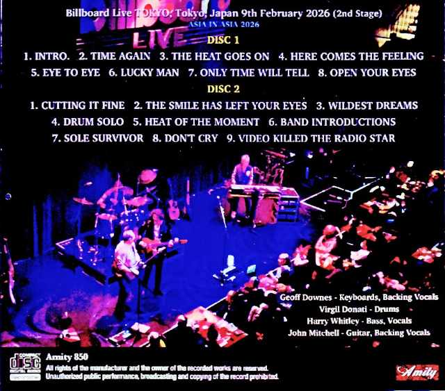 This release features a full 1 hour and 24 minute recording of the second show of the second day of their 2026 Japan tour, which aimed to recreate the setlist from “ASIA IN ASIA,” recorded from a high-quality audience master released by the taper. The tour, following on from the previous year, consisted of 10 shows over 5 days with two performances per day, and this final stage is captured in soundboard-level quality. Now, 43 years after their legendary first visit in 1983, they return to Japan with the same flow and structure. Harry Whitley’s vocals, reminiscent of John Wetton, have been particularly praised, showing even further evolution from the previous year. Furthermore, as this is a recreation of “ASIA IN ASIA,” they also performed “Eye To Eye” and “The Smile Has Left Your Eyes,” songs not included in the previous year’s performance. This is a must-have, Japan-exclusive memorial item for fans familiar with the original Asia. Live at Billboard Live Tokyo, Tokyo Japan 9th February 2026 (2nd Stage) : from Original Masters Disc 1 : 1. Intro. 2. Time Again 3. The Heat Goes On 4. Here Comes the Feeling 5. Eye to Eye 6. Lucky Man 7. Only Time Will Tell 8. Open Your Eyes Disc 2 : 1. Cutting It Fine 2. The Smile Has Left Your Eyes 3. Wildest Dreams 4. Drum Solo 5. Heat of the Moment 6. Band Introductions 7. Sole Survivor 8. Don’t Cry 9. Video Killed the Radio Star Geoffrey Downes – Keyboards / Harry Whitley – Vocals, Bass / John Mitchell – Guitar / Virgil Donati – Drums