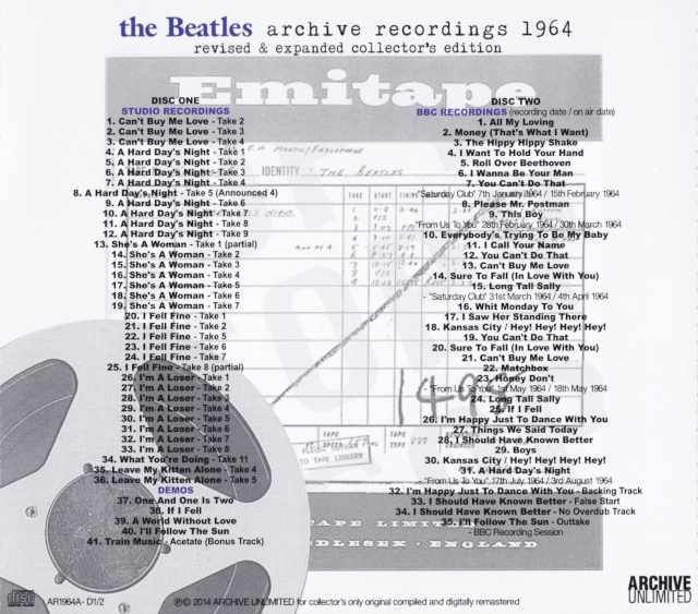 A must-have for Beatles fans, “Archive Recordings 1964” is the second installment of this rare recording collection, following “1963.” This second installment features newly re-edited and upgraded 2-CD collection featuring studio recordings, BBC live performances, and demos, including some never-before-seen material. Following on from “Bootleg Recordings 1963,” which was released digitally and focused on previously unreleased public domain (PD) material, the 1964 edition of “Archive Recordings” follows the same concept as its predecessor, compiling previously unreleased 1964 PD material from the same studio recordings, BBC recordings, and demos. The album also features studio recordings and demos, including previously known session takes, as well as upgraded and unearthed recordings since 2013. The album also includes extended session takes of “Can’t Buy Me Love,” “She’s a Woman,” and “I Feel Fine.” Also included is Paul’s much-anticipated demo of “A World Without Love,” a newly reissued and revised version of “I’ll Follow the Sun,” and a newly discovered acetate of “Train Music,” rumored to have been performed by Jimmy Page on “A Hard Day’s Night.” The album also includes all of the 1964 BBC tracks not previously included on the two official releases, including high-quality upgrades and session outtakes, making this the latest version of the 1964 BBC recordings. DISC ONE : STUDIO RECORDINGS 1. Can’t Buy Me Love – Take 2 2. Can’t Buy Me Love – Take 3 3. Can’t Buy Me Love – Take 4 4. A Hard Day’s Night – Take 1 5. A Hard Day’s Night – Take 2 6. A Hard Day’s Night – Take 3 7. A Hard Day’s Night – Take 4 8. A Hard Day’s Night – Take 5 (Announced 4) 9. A Hard Day’s Night – Take 6 10. A Hard Day’s Night – Take 7 11. A Hard Day’s Night – Take 8 12. A Hard Day’s Night – Take 9 13. She’s A Woman – Take 1 (partial) 14. She’s A Woman – Take 2 15. She’s A Woman – Take 3 16. She’s A Woman – Take 4 17. She’s A Woman – Take 5 18. She’s A Woman – Take 6 19. She’s A Woman – Take 7 20. I Fell Fine – Take 1 21. I Fell Fine – Take 2 22. I Fell Fine – Take 5 23. I Fell Fine – Take 6 24. I Fell Fine – Take 7 25. I Fell Fine – Take 8 (partial) 26. I’m A Loser – Take 1 27. I’m A Loser – Take 2 28. I’m A Loser – Take 3 29. I’m A Loser – Take 4 30. I’m A Loser – Take 5 31. I’m A Loser – Take 6 32. I’m A Loser – Take 7 33. I’m A Loser – Take 8 34. What You’re Doing – Take 11 35. Leave My Kitten Alone – Take 4 36. Leave My Kitten Alone – Take 5 DEMOS 37. One And One Is Two 38. If I Fell 39. A World Without Love 40. I’ll Follow The Sun 41. Train Music – Acetate (Bonus Track) DISC TWO : BBC RECORDINGS (recording date / on air date) 1. All My Loving 2. Money (That’s What I Want) 3. The Hippy Hippy Shake 4. I Want To Hold Your Hand 5. Roll Over Beethoven 6. I Wanna Be Your Man 7. You Can’t Do That – “Saturday Club” 7th January 1964 / 15th February 1964 8. Please Mr. Postman 9. This Boy – “From Us To You” 28th February 1964 / 30th March 1964 10. Everybody’s Trying To Be My Baby 11. I Call Your Name 12. You Can’t Do That 13. Can’t Buy Me Love 14. Sure To Fall (In Love With You) 15. Long Tall Sally – “Saturday Club” 31st March 1964 / 4th April 1964 16. Whit Monday To You 17. I Saw Her Standing There 18. Kansas City / Hey! Hey! Hey! Hey! 19. You Can’t Do That 20. Sure To Fall (In Love With You) 21. Can’t Buy Me Love 22. Matchbox 23. Honey Don’t – “From Us To You” 1st May 1964 / 18th May 1964 24. Long Tall Sally 25. If I Fell 26. I’m Happy Just To Dance With You 27. Things We Said Today 28. I Should Have Known Better 29. Boys 30. Kansas City / Hey! Hey! Hey! Hey! 31. A Hard Day’s Night – “From Us To You” 17th July 1964 / 3rd August 1964 32. I’m Happy Just To Dance With You – Backing Track 33. I Should Have Known Better – False Start 34. I Should Have Known Better – No Overdub Track 35. I’ll Follow The Sun ? Outtake – BBC Recording session
