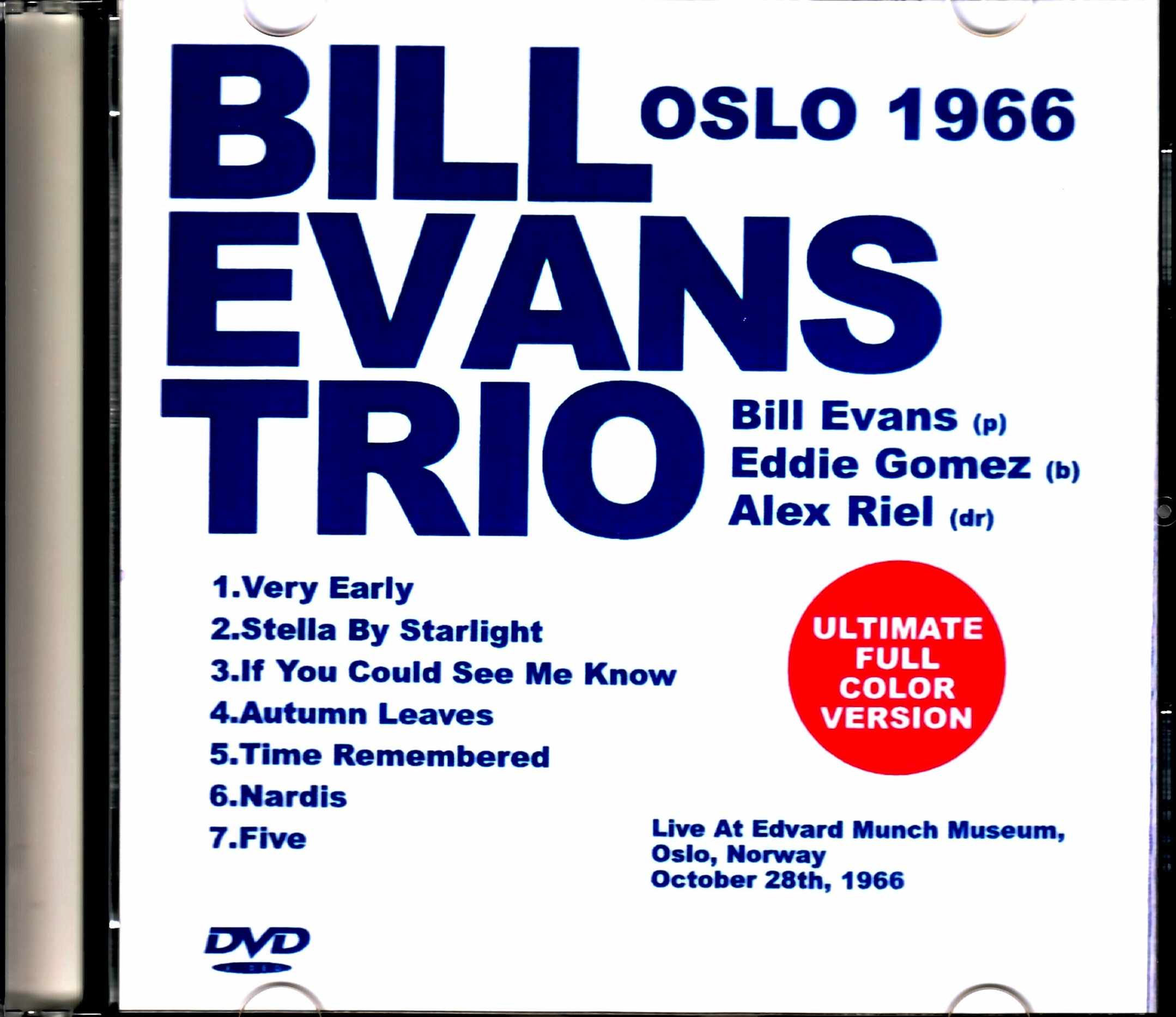 The 1966 trio footage of Eddie Gomez and Alex Leal has been fully implemented with the latest AI technology to achieve a natural colorization that is incomparable to the black and white footage of the past, and the sound has also been remastered and recorded in the highest quality. The live performance took place in a museum, with paintings on display at the back of the stage. Unlike a large concert hall, the stage and the audience are close, so I think the atmosphere is relaxed. The members are Eddie Gomez (b) and Alex Leal (ds). I think Eddie Gomez has only recently joined the trio, but he produces a very powerful sound. Gomez’s bass tends to be unstable at times, but when you watch the video, you can see that he is an extremely good-looking musician. Bill Evans’ piano is thin and nervous, and Riel’s performance is like that of European Larry Bunker. OSLO MUNCH MUSEUM, OCTOBER 1966 with EDDIE GOMEZ(b), ALEX RIEL(ds) 1.VERY EARLY 2.STELLA BY STARLOGHT 3.IF YOU COULD SEE ME NOW 4.AUTUMN LEAVES 5.TIME REMEMBRED 6.NARDIS 7.FIVE
