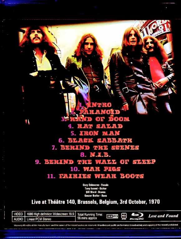 The classic pro-shot footage of the October 3, 1970 Brussels, Belgium concert, long known as the Paris concert, is now available in HD quality for the first time in recent rebroadcasts! Recorded on Blu-ray in the highest quality ever, without any loss of resolution from the master of a recent rebroadcast on Canadian on-demand TV channel Stingray iConcerts. The content needs no introduction as this is the definitive early footage, and it’s surprising that such high-quality footage hasn’t been officially released yet, but in any case, this is an item you won’t want to miss! Live at Théâtre 140, Brussels, Belgium, 3rd October, 1970 01. INTRO 02. PARANOID 03. HAND OF DOOM 04. RAT SALAD 05. IRON MAN 06. BLACK SABBATH 07. BEHIND THE SCENES 08. N.I.B. 09. BEHIND THE WALL OF SLEEP 10. WAR PIGS 11. FAIRIES WEAR BOOTS 58min. Full HD 1920×1080 16:9 NTSC Linear PCM Stereo Ozzy Osbourne – Vocals Tony Iommi – Guitar Bill Ward – Drums Geezer Butler – Bass