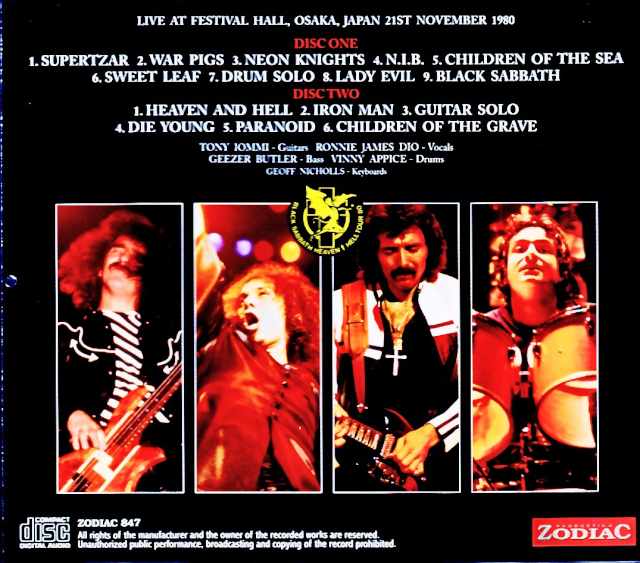 The legendary recording, hailed as “the greatest masterpiece of their first visit to Japan,” has been polished up! It’s now available as a top-of-the-line updated 2CD set, with the original master recording refined to perfection! This release captures the performance from November 21, 1980, at the Osaka Festival Hall. It’s an absolutely superb audience recording. Why is this recording considered a masterpiece? It’s due to both the sound and the show’s content. To explain why, let’s first look back at their legendary first visit to Japan and a list of their records. * November 16th ‘FACE OF EVIL (Nakano: Evening Show)’ * November 16th: Nakano Sun Plaza (Night Show) * November 17th ‘DEFINITIVE BUER (Nippon Seinenkan)’ * November 18th ‘EVILMANIA’ etc. * November 19th: Nakano Sun Plaza (Cancelled) * November 20th ‘KYOTO 1980’ * November 21st: Osaka Festival Hall ←★This release★ *Note: Only representative works from each day are listed. A legendary Osaka night that surpasses even the most famous FM broadcast. The above is a record of all six performances (the November 19th show was cancelled). The Osaka performance featured in this release is the final day and has been passed down as the best show of their first visit to Japan. Speaking of their first visit to Japan, the Nakano Sun Plaza show on November 18th is the most famous, and a certain broadcasting association’s FM broadcast and what appears to be the original soundboard recording have been leaked. It has become the symbol that immediately comes to mind when thinking of “Sabbath’s first visit to Japan.” However, the content of this show was poor. Tony Iommi suffered from food poisoning and was unable to continue the show midway through. It was so serious that the show the following day was cancelled. Moreover, the FM broadcast version has a strange mix with the keyboards being ridiculously loud. It was such a mediocre recording that it damaged Ronnie Sabbath’s reputation until the official “LIVE EVIL” was released. However, the food poisoning did not last long and he recovered quickly. At “KYOTO 1980” on November 20th, Iommi had recovered to his usual self (albeit with a slightly tentative feel). On the final day in Osaka (this release), they delivered a passionate performance from the very beginning, as if to redeem themselves. The excitement was so great that they performed multiple encores, even playing “Children Of The Grave,” a song they hadn’t played at other shows. Sound, number of songs, great performance… everything was perfect, making it the best gig of their first visit to Japan. GRAF ZEPPELIN’s meticulous mastering sets a new record high. This Osaka performance has also long been known for the existence of a legendary recording with superb sound quality. It’s a famous recording that was featured on the classic album “THE LAST SACRAMENT” and has long been available as a soundboard recording. The previous release, “Zodiac 382,” was the first to directly transfer this original cassette to CD, solidifying its reputation as “the greatest masterpiece of their first visit to Japan.” This release is a re-polished version of that same master by “GRAF ZEPPELIN.” They employed every technique imaginable, including rigorous pitch/phase correction and balance adjustment, but what was particularly effective this time was the reduction of hiss noise through frequency band correction. The high-frequency hiss that was somewhat noticeable in the original recording has been carefully addressed, resulting in a significant improvement in clarity. The details of the performance sound now stand out even more clearly. Another improvement is the remarkably natural joining of the supplementary parts using separate sound sources. This recording was made by the taper simultaneously recording with two pieces of equipment, and (perhaps due to concerns about tape remaining) the recording was stopped between songs on the main master. These parts were supplemented with sub-recordings, but until now, the difference in sound quality at the transitions was noticeable. “GRAF ZEPPELIN” eliminates this awkwardness. Strictly speaking, there is a warp-like feeling of a fraction of a second at the transition, but the difference in sound quality before and after the switch is eliminated, making it sound so natural that it sounds as if the same tape was simply paused (for a moment). The final performance, where everyone was energized by Iommi’s return, is depicted in this remastered sound as a full Osaka show where everyone is in top form. The number of songs and the content of the performance are incomparable to the FM broadcast that was interrupted. First, let’s check out the full set. Heaven & Hell (5 songs) – Neon Knights / Children Of The Sea / Lady Evil / Heaven And Hell / Die Young (★) Classics (7 songs) – Black Sabbath: N.I.B. / Black Sabbath – Paranoid: War Pigs / Iron Man / Paranoid (★) – Master of Reality: Sweet Leaf / Children Of The Grave (★★) *Note: Songs marked with “★” cannot be heard on the famous FM broadcast of the Nakano performance. In particular, songs marked with “★★” are special songs played only on this day as it is their first visit to Japan. And the performance itself is absolutely superb. Iommi’s powerful riffs have recovered, Geezer Butler creates a wall of sound in response to the guitar, Vinnie Appice creates a sense of speed with his unique sharp tom-tom fills – and Ronnie James Dio. Ronnie’s vocals are incredibly versatile, shifting from aggressive roars to romantic melodies in the next moment, with dynamics that swing wildly from phrase to phrase. This is a truly unique and masterful performance, capturing the exhilaration of the final day of their first visit to Japan and the relief of Iommi’s return. This legendary recording, renowned as “the greatest masterpiece of their first visit to Japan,” has bee