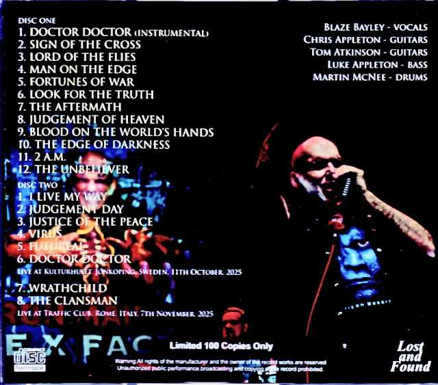 Blaze Bayley, who played on two Maiden albums, “The X Factor” in 1995 and “Virtual Eleven” in 1998, but left the band when Bruce Dickinson returned, embarked on a European tour recreating the entirety of “The X Factor,” marking the band’s 30th anniversary in 2025. This release features a complete recording of the October 11th show in Jönköping, Sweden, from a digital audience master. The album features tracks never before performed live by Maiden, including three B-side singles. Two bonus tracks not performed on the day are also included, recorded from a November 7th performance in Rome, Italy. Blaze’s vocals are spot-on, faithful to the album, and the band’s performance is superb, making this a must-listen for fans. disc 1 : 1. DOCTOR DOCTOR (instrumental)/2. SIGN OF THE CROSS/3. LORD OF THE FLIES/4. MAN ON THE EDGE/5. FORTUNES OF WAR/6. LOOK FOR THE TRUTH/7. THE AFTERMATH/8. JUDGEMENT OF HEAVEN/9. BLOOD ON THE WORLD’S HANDS/10. THE EDGE OF DARKNESS/11. 2 A.M./12. THE UNBELIEVER disc 2 : 1. I LIVE MY WAY/2. JUDGEMENT DAY/3. JUSTICE OF THE PEACE/4. VIRUS/5. FUTUREAL/6. DOCTOR DOCTOR at Kulturhuset, Jonkoping, Sweden 11th October 2025 7. WRATHCHILD/8. THE CLANSMAN at Traffic Club, Rome, Italy 7th November 2025 Blaze Bayley – vocals / Chris Appleton – guitars / Tom Atkinson – guitars / Luke Appleton – bass / Martin McNee – drums