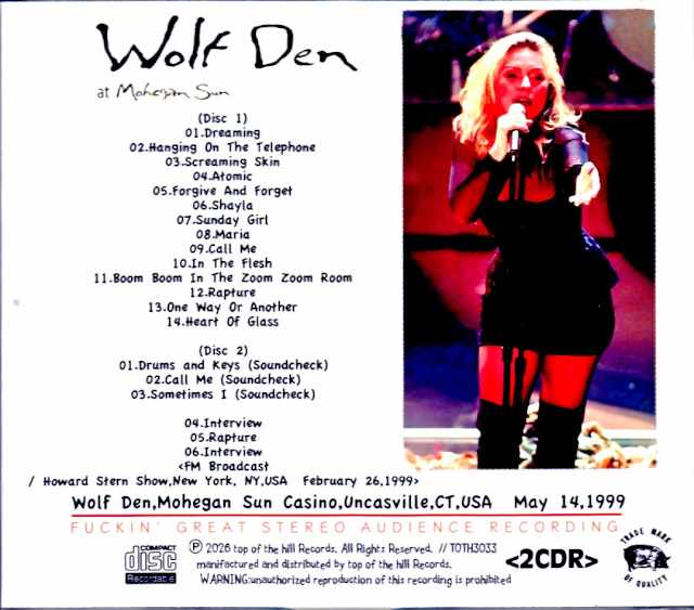 Blondie, having reunited, presents a new item featuring a high-quality stereo audience recording of their May 1999 performance in Uncasville, Connecticut! This new item captures the live performance held on May 14, 1999, at the Wolf Den, an event venue within the Mohegan Sun Casino in Uncasville, Connecticut, as part of the “NO EXIT TOUR,” which followed the release of their seventh album, “NO EXIT,” their first in 17 years. The recording is a high-quality stereo audience recording. Directly digitally transferred from the DAT master, it boasts a wide range and a deep sound image, with the vocals and each instrument recorded with excellent balance and clarity. Two sources exist for this recording; one is a lower-quality mono audience recording. However, this release uses the superior source, which includes the sound check from the day of the live performance. This release features four tracks selected from “NO EXIT,” including “Maria,” the lead single released prior to the album and their first UK number one hit in 19 years, as well as the ska numbers “Screaming Skin,” “Forgive And Forget,” and “Boom Boom In The Zoom Zoom Room,” which open the album. You can also enjoy a superb setlist that summarizes their work up to that point, including the 1980 hit “Call Me” and the hit single “Heart Of Glass” from their third album “PARALLEL LINES,” all in immersive, high-quality stereo audience recording! They played a cover of The Plasmatics’ “Sometimes I” during the soundcheck, a rare number that wasn’t performed in the main live show. In addition, an interview from their appearance on New York FM radio on February 26th of the same year and a studio live version of “Rapture” are included! Of course, these are also recorded in high-quality stereo soundboard recording. Wolf Den,Mohegan Sun Casino,Uncasville,CT,USA May 14,1999 (Disc 1) 01.Dreaming 02.Hanging On The Telephone 03.Screaming Skin 04.Atomic 05.Forgive And Forget 06.Shayla 07.Sunday Girl 08.Maria 09.Call Me 10.In The Flesh 11.Boom Boom In The Zoom Zoom Room 12.Rapture 13.One Way Or Another 14.Heart Of Glass (Disc 2) 01.Drums and Keys (Soundcheck) 02.Call Me (Soundcheck) 03.Sometimes I (Soundcheck) FM Broadcast / Howard Stern Show,New York, NY,USA February 26,1999 04.Interview 05.Rapture 06.Interview