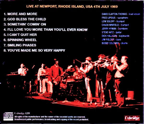 In 1969, BLOOD, SWEAT & TEARS quickly rose to become the darlings of the era when their second album became a huge hit, reaching number one in the United States. Introducing a valuable original recording that conveys the era of its peak to the present day. What is infused into this work is “July 4, 1969 Rose Island performance”. This is an audience recording recorded at the scene of “NEWPORT JAZZ FESTIVAL”, a music festival that gave birth to many legends. Speaking of “NEWPORT JAZZ FESTIVAL”, people tend to think of jazz, blues, gospel, etc., but since 1969, they have opened up their disciples to rock as well. It is also widely known for the appearance of LED ZEPPELIN. Many artists participated over several days, but BLOOD, SWEAT & TEARS appeared on the second day. We shared the stage with JEFF BECK GROUP, JETHRO TULL, TEN YEARS AFTER, etc. Also, as mentioned earlier, 1969 was the golden age of big hits. In order to get a sense of its momentum, let’s look back at the show’s position from the schedule at that time. ・January 2nd – March 8th: North America #1 (20 performances) [March: Single “You’ve Made Me So Very Happy” released] ・March 19th – April 12th: North America #2 ( 9 performances) ・May 9th + 10th: North America #3 (2 performances)《May: Single “Spinning Wheel” released》 ・June 22nd – August 29th: North America #4 (15 performances) ←★Here ★《September 30th: Single “And When I Die” released》 October 4th – November 25th: North America #5 (12 performances) December 26th – 28th: North American #6 (3 performances) This is BLOOD, SWEAT & TEARS in 1969. Their second album, “BLOOD, SWEAT & TEARS,” was released at the end of 1968, and they began touring afterwards. They toured North America with the singles “You’ve Made Me So Very Happy,” “Spinning Wheel,” and “And When I Die,” which were huge hits (all reaching #2 in the U.S.). The Newport performance of this work was the fourth concert of “North America #4” that was in the middle of that. The people who were spinning the tape at such a historical scene were actually Japanese. It was digitized directly from a master tape that was personally recorded by a certain music critic at the time. The sound is truly a time capsule. It is just a vintage spatial recording, but there is no sense of distance, probably because it was a seat for the people involved. The core of the powerful performance is right in front of your eyes, and there are no voices from the audience around you. You can simply immerse yourself in the thick ensemble and David Clayton Thomas’ powerful singing voice. In fact, the peak is distorted in the opening song “More And More”, which is full of power, which is a little surprising, but after that it gradually calms down, and the further you go in the second half, the more you can enjoy the deep brass rock. What is depicted with such sound is a stage that truly celebrates spring in our world. Since it’s a festival, it’s only a little under 50 minutes long, but it’s packed full of early masterpieces. Let’s organize the contents here. CHILD IS FATHER TO THE MAN (2 songs)・I’ll Love You More Than You’ll Ever Know/I Can’t Quit Her BLOOD, SWEAT & TEARS (5 songs)・More And More/God Bless The Child/Spinning Wheel/Smiling Phases/You’ve Made Me So Very Happy BLOOD, SWEAT & TEARS 3 (1 song)/Somethin’ Comin’ On…and it goes like this. They played half of “BLOOD, SWEAT & TEARS,” focusing on the hit singles “You’ve Made Me So Very Happy” and “Spinning Wheel.” In addition, he also shows off his valuable repertoire from the Al Cooper era and Joe Cocker’s cover “Somethin’ Comin’ On,” which will be included in his 3rd album. The original cassette ended with the 16-minute “Smiling Phases,” but this work also includes the encore “You’ve Made Me So Very Happy” from a different master. We have made it possible for you to fully experience all 7 songs that are said to be all about the day. The performance that spells out such a set is wonderful. The members at that time were those nine people who created the 2nd & 3rd albums. Sherry Hyman, who did not participate in the legendary first visit to Japan, is also present, and the flexible and passionate interplay between the originators is constantly unfolding. And Clayton Thomas’ vocalization. As the show progresses, the peak distortion disappears and the performance becomes clearer, but when Clayton puts his best foot forward, it still shakes out. While carrying the best brass rock of our time with 8-person horsepower, you can enjoy the powerful vocals that become the main character right in front of your eyes. “NEWPORT JAZZ FESTIVAL” has carved out many legends in American music history. This is an extremely rare live album where you can enjoy the live performance of BLOOD, SWEAT & TEARS in their prime on that big stage. This was the pinnacle of brass rock of our time, resounding as the 1970s approached. Newport, Rhode Island, USA 4th July 1969 PERFECT SOUND(from Original Masters) (48:18) 1. More And More 2. God Bless The Child 3. Somethin’ Comin’ On 4. I’ll Love You More Than You’ ll Ever Know 5. I Can’t Quit Her 6. Spinning Wheel 7. Smiling Phases Encore: 8. You’ve Made Me So Very Happy David Clayton-Thomas – lead vocals Fred Lipsius – saxophone Lew Soloff – trumpet Chuck Winfield – trumpet Jerry Hyman – trombone Steve Katz – guitar Dick Halligan – keyboards Jim Fielder – bass Bobby Colomby – drums