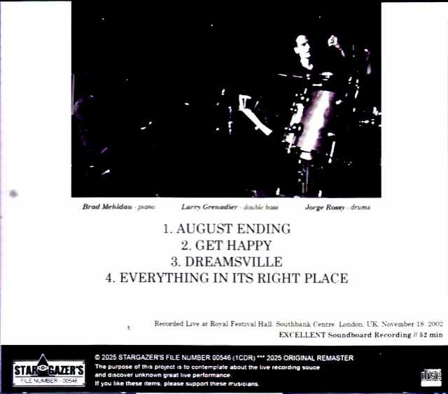 This 52-minute recording of the November 18th London performance from the trio’s UL tour, digitally remastered from the FM on-air master, is available on stereo soundboard. While primarily performing in a traditional piano trio style, the band also began incorporating rock and pop influences, including Costello and Radiohead, both of which have become staples of their solo live repertoire in recent years. Recorded at Royal Festival Hall, Southbank Centre, London, UK, November 18th 2002 / Soundboard Recording: 1. AUGUST ENDING 2. GET HAPPY 3. DREAMSVILLE 4. EVERYTHING IN ITS RIGHT PLACE Brad Mehldau – piano / Larry Grenadier – double bass / Jorge Rossy – drums