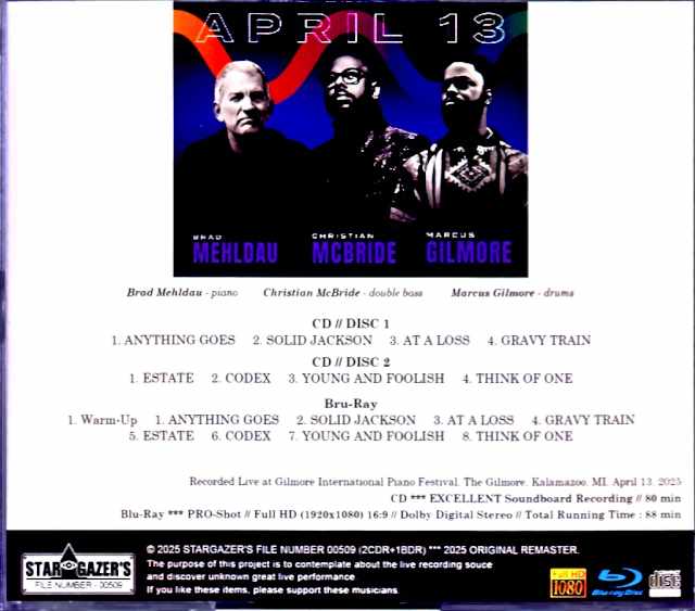 This is a live recording of Brad Mehldau’s trio. This audio and video recording captures the band’s performance at the 2025 Gilmore International Piano Festival. The audio has been edited to allow for a fast-paced listening experience. The video, recorded on Blu-ray in high definition, allows you to enjoy the band members’ interactions with fans between songs as well as their interactions with each other. Each recording is a valuable and highly collectible piece. Recorded Live at Gilmore International Piano Festival, The Gilmore, Kalamazoo, MI, April 13, 2025 CD *** EXCELLENT Soundboard Recording // 80 min Blu-Ray *** PRO-Shot // Full HD (1920×1080) 16:9 // Dolby Digital Stereo // Total Running Time : 88 min CD / DISC 1 1. ANYTHING GOES 2. SOLID JACKSON 3. AT A LOSS 4. GRAVY TRAIN CD / DISC 2 1. ESTATE 2. CODEX 3. YOUNG AND FOOLISH 4. THINK OF ONE Bru-Ray 1. Warm-Up 1. ANYTHING GOES 2. SOLID JACKSON 3. AT A LOSS 4. GRAVY TRAIN 5. ESTATE 6. CODEX 7. YOUNG AND FOOLISH 8. THINK OF ONE Brad Mehldau – piano Christian McBride – double bass Marcus Gilmore – drums