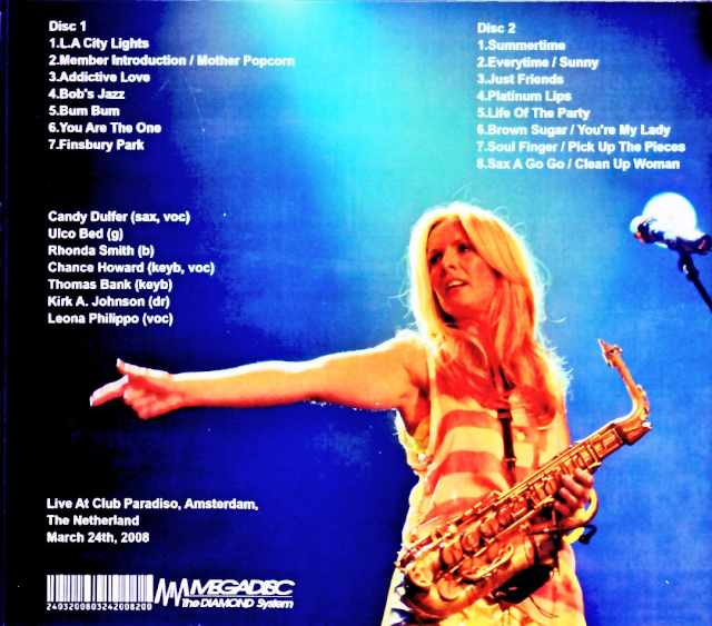Candy Dulfer, a top saxophonist in the Funk and Smooth Jazz world, has released a definitive recording of her 2008 live performance at the prestigious Amsterdam club “Paradiso,” captured in stereo soundboard audio that completely replaces previous recordings. Her signature groovy and vibrant sound, based on funk, features pop and melodic phrases, and her interaction with the audience, which unites the club’s energy, creates a dynamism that surpasses her studio works. The relaxed atmosphere unique to a local performance is also impressive, and the performance is filled with a more soulful and danceable charm. Her sharp blowing supported by a keen rhythm section, her heartfelt ballad expressions, and the long improvisations unique to live performances allow you to experience her entertainer and skill as a player in the most direct way possible. Covers of James Brown’s “Mother Popcorn,” Bobby Hebb, and the 1966 hit “Sunny” are also highlights. Live At Club Paradiso, Amsterdam, The Netherland March 24th, 2008 Disc 1 1.L.A City Lights 2.Member Introduction / Mother Popcorn 3.Addictive Love 4.Bob’s Jazz 5.Bum Bum 6.You Are The One 7.Finsbury Park Disc 2 1.Summertime 2.Everytime / Sunny 3.Just Friends 4.Platinum Lips 5.Life Of The Party 6.Brown Sugar / You’re My Lady 7.Soul Finger / Pick Up The Pieces 8.Sax A Go Go / Clean Up Woman Candy Dulfer(sax, voc) Ulco Bed(g) Rhonda Smith(b) Chance Howard(keyb, voc) Thomas Bank(keyb) Kirk A. Johnson(dr) Leona Philippo(voc)