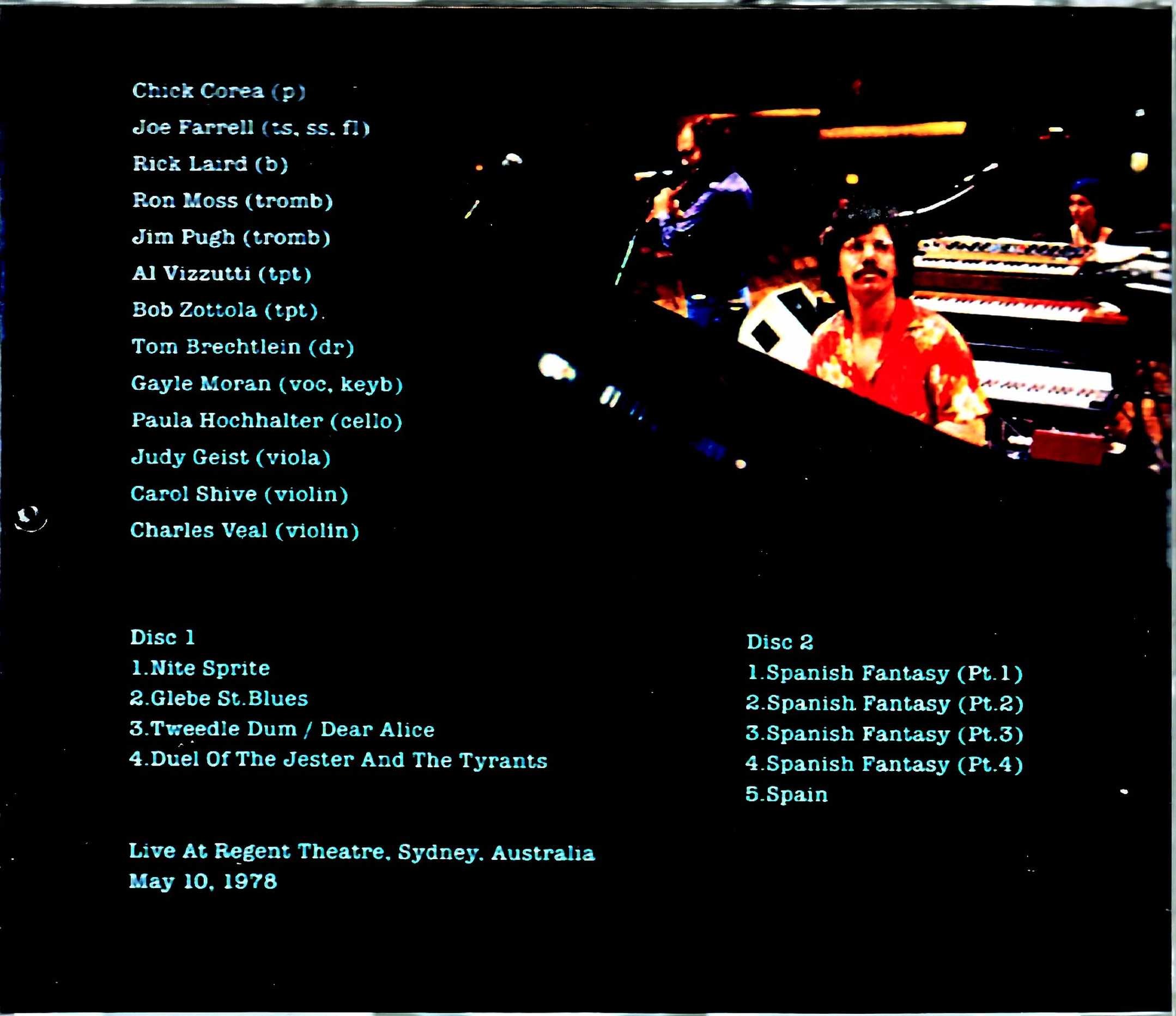 After the release of “Mad Hatter,” Chick’s masterpiece, this is a two-disc live album with official sound quality, recorded on May 10th at the Regent Theater in Sydney, Australia, from a world tour with the master of a broadcast sound source. The album “My Spanish Heart,” released after the development and dissolution of RTF, and the album “Mad Hatter,” based on the well-known Lewis Carroll masterpiece “Alice in Wonderland,” are said to be masterpieces among his many albums, as they are albums in which Chick Corea’s sensibility as a composer reached its peak. The live performance released this time is a recording from a world tour centered on songs picked from those two albums. On sax, Joe Farrell, whom Chick trusts, will play his dynamic sax and melancholy flute. On bass, Rick Laird, who sadly passed away this year (2021) after joining the Mahavishnu Orchestra, will play. Eddie Gomez participated in the album, but Rick joined from the world tour. If you listen to this live performance, you will be convinced that this change was a great success. In addition, strings also participated in the live performance, so the musicality of the album is reproduced. Also, “Duel between the Clown and the Tyrant” recorded on the album “Romantic Knight” is performed as a masterpiece of over 23 minutes in parts 1 and 2. This is definitely a must-listen for fans. While it is completely official quality, you can enjoy a colorful show that is completely different from the official work. Live at the Regent Theatre, Sydney, Australia 05/10/1978 Disc 1 1.Nite Sprite 2.Glebe St.Blues 3.Tweedle Dum / Dear Alice 4.Duel Of The Jester And The Tyrants Disc 2 1.Spanish Fantasy(Pt.1) 2.Spanish Fantasy(Pt.2) 3.Spanish Fantasy(Pt.3) 4.Spanish Fantasy(Pt.4) 5.Spain Chick Corea(p) Joe Farrell(ts, ss, fl) Rick Laird(b) Ron Moss(tromb) Jim Pugh(tromb) Al Vizzutti(tpt) Bob Zottola(tpt) Tom Brechtlein(dr) Gayle Moran(voc, keyb) Paula Hochhalter(cello) Judy Geist(viola) Carol Shive(violin) Charles Veal(violin)