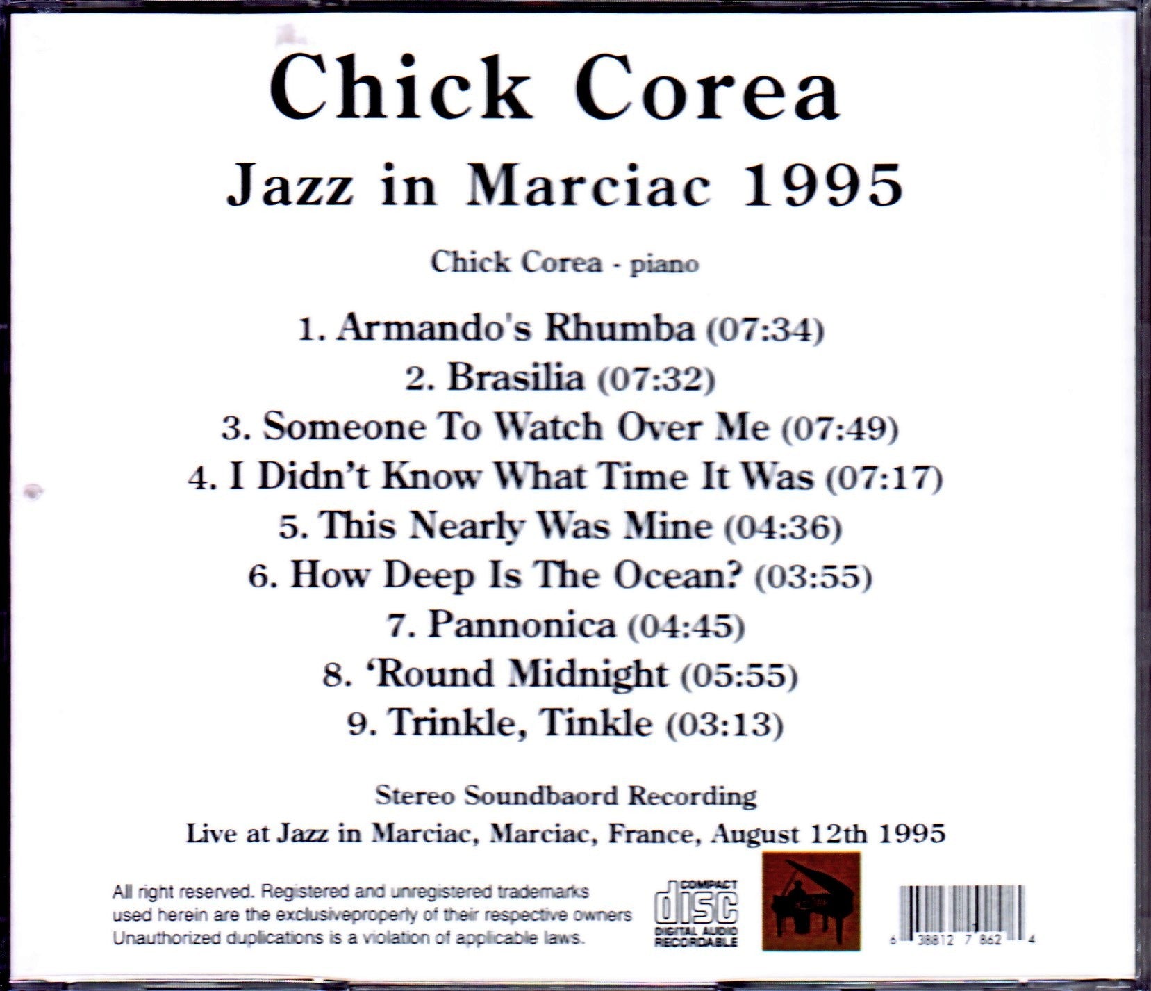 A beautiful solo performance with one piano at the jazz festival “Jazz In Marcisc” held in France in August 1995 is recorded on a high-quality soundboard. He began his career around 1964 by collaborating with Blue Mitchell, Herbie Mann, and Mongo Santamaria, and in 1968 released his debut album, “Tones for Jones Bones,” at the age of 25. Chick Corea joined the Miles Davis Group in late 1968, replacing Herbie Hancock, and is still on his way to becoming a jazz legend. The composition is centered around standard songs, so you can enjoy the swing feel of mainstream jazz. Because he uses Yamaha pianos, Corea’s pianos have a dry, immediate sound that stands out for their mobility and agility. When I listen to performances like this, I sometimes get the strange feeling that he is the reincarnation of Mozart. Live at Jazz in Marciac,Marciac,France August.12th.1995 Armando’s Rhumba (Chick Corea) Brasilia (Chick Corea) Someone To Watch Over Me (George Gershwin, Ira Gershwin) I Didn’t Know What Time It Was (Richard Rodgers, Lorenz Hart) This Nearly Was Mine (Richard Rodgers, Oscar Hammerstein) How Deep Is The Ocean? (Irving Berlin) Pannonica (Thelonious Monk) ‘Round Midnight (Thelonious Monk) Trinkle, Tinkle (Thelonious Monk) Chick Corea (piano)