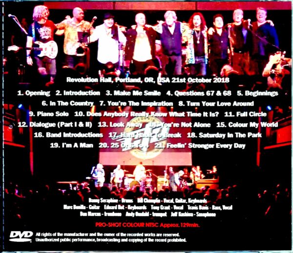 CALIFORNIA TRANSIT AUTHORITY (CTA) was formed by Danny Seraphine to revive the sound and soul of early/mid-period CHICAGO. A super-excellent video featuring Bill Champlin is now available. This work was filmed at the “Portland performance on October 21, 2018.” This is a multi-camera professional shot taken when he appeared at the charity event “CONCERT FOR CANCER”. This event was literally aimed at supporting cancer research and treatment programs. Danny has never had cancer, but Bill lost his beloved son to esophageal cancer and developed prostate cancer himself. In 2018, I had just made a comeback after battling illness for about a year. Of course, speaking of CTA in 2018, the performance in Japan in April is memorable for us, but this work takes place half a year after that. This work, which was completed in such a show, is truly the best. I feel like there are a lot of frontal angles for an official video work, but that’s just a matter of switching. There are various angles that capture each member individually, and most importantly, the image quality / sound quality / mix is perfect. As a CTA live work, it is a quasi-official item that you want to keep alongside the original album. What is portrayed with such ironclad quality is an evening of CHICAGO music that will revive the performance in Japan. Unfortunately, Donnie Dacus does not participate in this work, but in addition to Danny and Bill, Mark Bonilla and Travis Davis of KEITH EMERSON BAND, Ed Ross, and a cover of “Hard to Say I’m Sorry” The core of the band is Tony Grant, formerly of AZ YET, who is also known for recording a hit in the United States, and other members visiting Japan. There is no doubt that we can expect CHICAGO’s famous songs based on the unit’s concept, but the selection may be a little different than expected. Their debut work “FULL CIRCLE” was also a collection of CHICAGO covers, so let’s compare and organize them. The trajectory of Chicago in the 60s/70s: Introduction (★) / Questions 67 & 68 / Beginnings / Does Anybody Really Know What Time It Is? / I’m a Man (★) ・Chicago and 23 Oaths: Make Me Smile (★) / In The Country / Color My World (★) / 25 Or 6 To 4 (★)・Chicago V: Dialogue (Part I & II)/Saturday In The Park・Harukanaru Amerika: Feelin’ Stronger Everyday After the 80s ・Chicago 17: You’re The Inspiration/Hard Habit To Break ・Chicago 19: Look Away/You’re Not Alone ・Others: Turn Your Love Around/Full Circle *Note: “★” indicates the debut album ” FULL CIRCLE” is the same song. …and it looks like this. The heaping amount of CHICAGO repertoire is interspersed with the original “Full Circle” from the second album and “Turn Your Love Around”, which Bill wrote for George Benson. However, the selection of CHICAGO songs is very different from “FULL CIRCLE”, and only 5 of the 18 songs in this work are duplicates. Rather than calling it a “visual version of his debut work,” it’s “another selection of masterpieces.” It is a super delicious show where you can enjoy updated versions of CHICAGO masterpieces that cannot be heard even in official works. It is a video work that is on par with the official work in terms of quality and content, and will revive the performance in Japan. A piece where you can fully enjoy the CTA, which is said to be “another CHICAGO”, in super high quality. Multi-camera pro shot of “October 21, 2018 CONCERT FOR CANCER performance”. You can enjoy an evening of CHICAGO music with completely official quality professional shots. There are only five songs that overlap with the debut album “FULL CIRCLE”, and the original “Full Circle” recorded on the second album and “Turn Your Love Around”, which Bill wrote for George Benson, will also be performed. This is the most important work that is semi-official in terms of quality and content. Revolution Hall, Portland, OR, USA 21st October 2018 PRO-SHOT 1. Opening 2. Introduction 3. Make Me Smile 4. Questions 67 & 68 5. Beginnings 6. In The Country 7. You’re The Inspiration 8. Turn Your Love Around 9. Piano Solo 10. Does Anybody Really Know What Time It Is? 11. Full Circle 12. Dialogue (Part I & II) 13. Look Away 14. You’re Not Alone 15. Color My World 16. Band Introductions 17. Hard Habit To Break 18. Saturday In The Park 19. I’m A Man 20. 25 Or 6 To 4 21. Feelin’ Stronger Every Day Danny Seraphine – Drums Bill Champlin – Vocal, Guitar, Keyboards Marc Bonilla – Guitar Edward Roth – Keyboards Tony Grant – Vocal Travis Davis – Bass, Vocal Dan Marcus – trombone Andy Omdahl – trumpet Jeff Kashiwa – Saxophone PRO-SHOT COLOR NTSC Approx.129min.