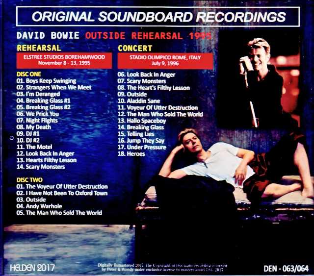 This release features high-quality soundboard recordings of rehearsals from the 1995 tour supporting the album “Outside.” Disc 2 also includes a soundboard recording of the Rome performance from the same tour on July 9, 1996. REHEARSAL ELSTREE STUDIOS BOREHAMWOOD November 8-13, 1995 DISC ONE 01. Boys Keep Swinging 02. Strangers When We Meet 03. I’m Deranged 04. Breaking Glass #1 05. Breaking Glass #2 06. We Prick You 07. Night Flights 08. My Death 09. DJ #1 10. DJ #2 11. The Motel 12. Look Back In Anger 13. Hearts Filthy Lesson 14. Scary Monsters DISC TWO 01. The Voyeur Of Utter Destruction (as Beauty) 02. I Have Not Been To Oxford Town 03. Outside 04. Andy Warhole 05. The Man Who Sold The World CONCERT Roma, Curva Sud dello Stadio Olimpico July 9, 1996 06. Look Back In Anger 07. Scary Monsters 08. The Heart’s Filthy Lesson 09. Outside 10. Aladdin Sane 11. Voyeur Of Utter Destruction (as Beauty) 12. The Man Who Sold The World 13. Hallo Spaceboy 14. Breaking Glass 15. Telling Lies 16. Jump They Say 17. Under Pressure 18. Heroes