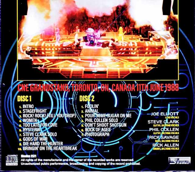 This 1.5-hour recording captures the June 11th Toronto, Canada performance from their 1988 North American tour following the release of their massive hit album “HYSTERIA,” using a newly discovered, high-quality audience master recording. This is a never-before-seen recording, considered A-grade for a cassette recording of that era, and features a setlist almost identical to their Japan performance, which took place shortly before this show. Live at CNE Grandstand, Toronto, ON, Canada 11th June 1988 Disc 1 : 01. Intro 02. Stagefright 03. Rock! Rock! (Till You Drop) 04. Women 05. Too Late for Love 06. Hysteria 07. Steve Clark’s Guitar Solo 08. Gods of War 09. Die Hard The Hunter 10. Bringin’ on the Heartbreak Disc 2: 1. Foolin’ 2. Animal 3. Pour Some Sugar on Me 4. Phil Collen’s Guitar Solo 5. Don’t Shoot Shotgun 6. Rock of Ages 7. Photograph Joe Elliott – Lead Vocal / Phil Collen – Guitar / Steve Clark – Guitar / Rick Savage – Bass / Rick Allen – Drums
