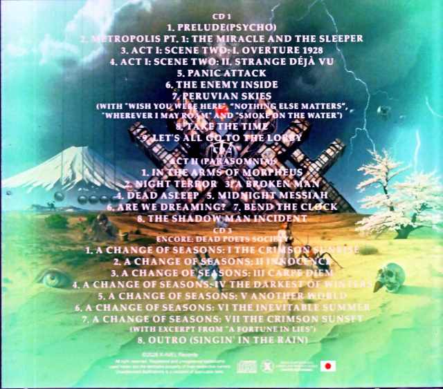 Fans have been eagerly awaiting this release: a complete recording of the February 26th show at EX Theater Roppongi, the second day of Dream Theater’s 40th Anniversary Japan Tour, captured in astonishingly high-quality sound. This is a multi-stereo IEM matrix audio source from the familiar label. Multiple IEM sources with different mix balances used by each band member on stage are exquisitely blended with the label’s original high-quality audience source into a stereo mix. The keyboards and guitars are perfectly separated into left and right channels, the drums are overwhelmingly clear with their stereo separation, the bass boasts a powerful, gritty midrange characteristic of line-in sources, and the vocals have a strong presence in the center. The result is an ideal live sound that captures every aspect of the band’s sound with astonishing separation and resolution approaching that of a stereo soundboard recording, while also conveying the live atmosphere, such as the deep bass and the excitement of the audience. Click tracks are used on some songs, mainly new material, but they are almost entirely absent on landmark numbers like the opening “Metropolis,” so you should be able to enjoy the show without any stress. The two-part, nearly three-hour-long, passionate performances on this tour show significant changes in content from day to day, and this second Tokyo performance at EX Theater is completely different from the tour’s opening show at Nippon Budokan the day before, so we highly recommend listening to both days in this highest sound quality to compare them. This is the fastest and definitive title that conveys the entirety of the special tour celebrating the band’s 40th anniversary, which began with Mike Portnoy’s surprise return. A limited edition memorial item with a Japanese obi strip. Contents = February 26, 2026, Tokyo performance, second day Audio source = Multi-stereo IEM matrix recording EX Theater Roppongi, Tokyo, Japan 26th February 2026 CD 1 01. Prelude (Psycho) 02. Metropolis Pt. 1: The Miracle and the Sleeper 03. Act I: Scene Two: I. Overture 1928 04. Act I: Scene Two: II. Strange Déjà Vu 05. Panic Attack 06. The Enemy Inside 07. Peruvian Skies 08. Take the Time 09. Let’s All Go to the Lobby CD 2 Act II (Parasomnia): 01. In the Arms of Morpheus 02. Night Terror 03. A Broken Man 04. Dead Asleep 05. Midnight Messiah 06. Are We Dreaming? 07. Bend the Clock 08. The Shadow Man Incident CD 3 Encore: Dead Poets Society 01. A Change of Seasons: I The Crimson Sunrise 02. A Change of Seasons: II Innocence 03. A Change of Seasons: III Carpe Diem 04. A Change of Seasons: IV The Darkest of Winters 05. A Change of Seasons: V Another World 06. A Change of Seasons: VI The Inevitable Summer 07. A Change of Seasons: VII The Crimson Sunset 08. Outro (Singin’ in the Rain)