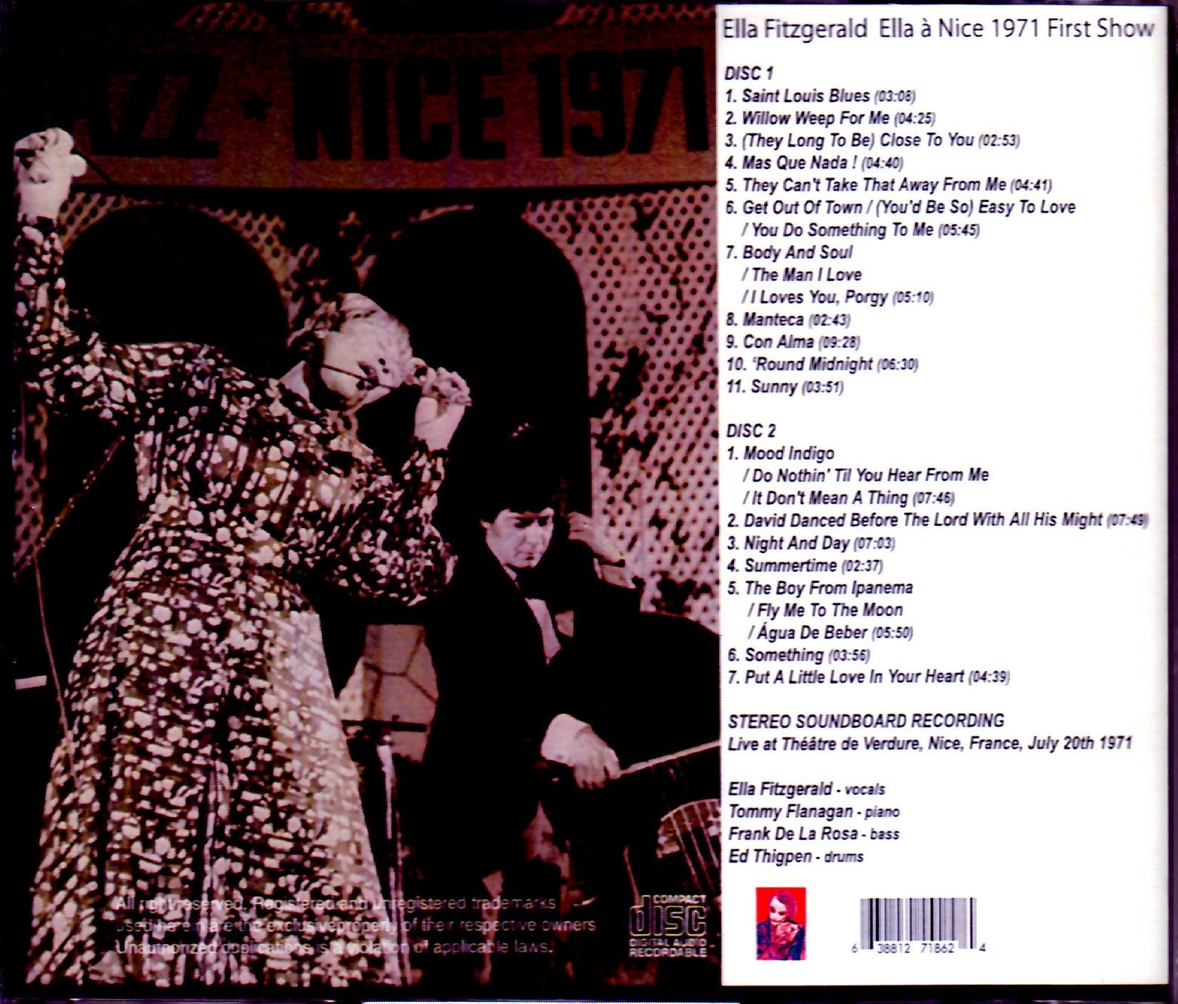 A complete recording of the Nice, France performance on July 20, 1971, the day before the official album “Ella à Nice” released in 1982, with the finest stereo soundboard sound source broadcast locally in recent years. The sound source appearing this time is a full live recording, including three songs performed by the Tommy Flanagan Trio who served as the backing, standard numbers such as George Gershwin and Cole Potter, and Duke Ellington. A complete collection of 15 songs, including performances by Ella Fitzgerald, who sings every song vividly, from medleys to George Harrison’s “Something.” You can fully enjoy the most wonderful live performance of Ella Fitzgerald, a songstress who is ranked alongside Billie Holiday and Sarah Vaughan, with the finest sound. DISC 1 1. Saint Louis Blues (03:08) 2. Willow Weep For Me (04:25) 3. (They Long To Be) Close To You (02:53) 4. Mas Que Nada! (04:40) 5. They Can’t Take That Away From Me (04:41) 6. Get Out Of Town / (You’d Be So) Easy To Love / You Do Something To Me (05:45) 7. Body And Soul / The Man I Love / I Loves You, Porgy (05:10) 8. Manteca (02:43) 9. Con Alma (09:28) 10. ‘Round Midnight (06:30) 11. Sunny (03:51) DISC 2 1. Mood Indigo / Do Nothin’ Til You Hear From Me / It Don’t Mean A Thing (07:46) 2. David Danced Before The Lord With All His Might (07:49) 3. Night And Day ( 07:03) 4. Summertime (02:37) 5. The Boy From Ipanema / Fly Me To The Moon / Água De Beber (05:50) 6. Something (03:56) 7. Put A Little Love In Your Heart (04:39) Live at Théâtre de Verdure, Nice, France, July 20th 1971 Ella Fitzgerald – vocals Tommy Flanagan – piano Frank De La Rosa – bass Ed Thigpen – drums Stereo Soundboard Recording