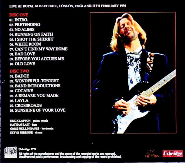 The 1991 London Royal Albert Hall performance, already known as the legendary 24-night series “24 Nights,” featured four different band configurations. This recording captures the final performance by the four-piece band on February 11th, almost in its entirety, from a high-quality DAT master recently unearthed, totaling 2 hours and 11 minutes. As the sixth and final night for the four-piece band, the performance is perfect and magnificent, with six tracks from the then-released “Journeyman”—”Pretending,” “No Alibis,” “Running On Faith,” “Bad Love,” “Before You Accuse Me,” and “Old Love”—being particularly electrifying and a must-listen. Because it’s a four-piece band, Clapton’s guitar is fully featured, and this is undoubtedly a peak moment in his career as a guitar player, captured in the best quality. Live at Royal Albert Hall, London, UK 11th February 1991 : from Original Masters Disc 1 : 1. Intro. 2. Pretending 3. No Alibis 4. Running On Faith 5. I Shot The Sheriff 6. White Room 7. Can’t Find My Way Home 8. Bad Love 9. Before You Accuse Me 10. Old Love Disc 2 : 1. Badge 2. Wonderful Tonight 3. Band Introductions 4. Cocaine 5. A Remark You Made 6. Layla 7. Crossroads 8. Sunshine Of Your Love Eric Clapton – guitar, vocals / Greg Phillinganes – keyboards / Nathan East – bass / Steve Ferrone – drums