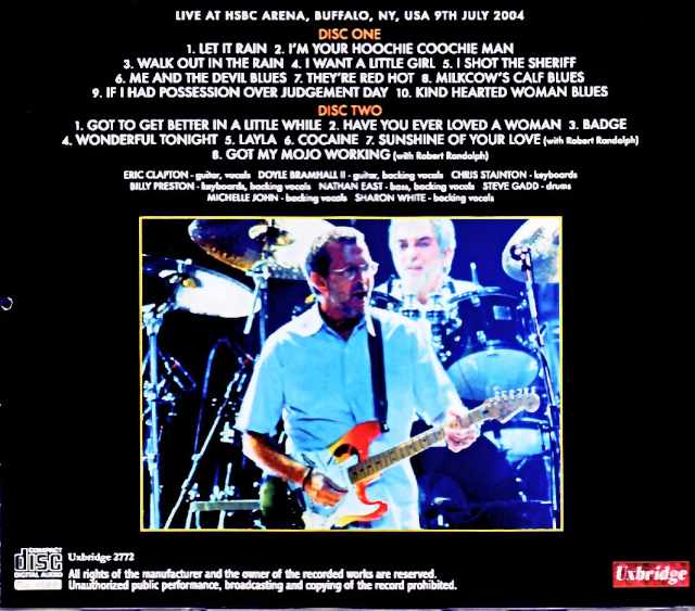 This release features a nearly complete 1 hour and 50 minute recording of the July 9th Buffalo, New York performance from the “Me & Mr. Johnson” North American tour held in the summer of 2004, taken from a high-quality DAT audience master recently released by a taper. First of all, the sound, recorded from the front row of the arena, directly captures the sound from the PA system, conveying the power of the band’s sound realistically, and is especially noteworthy for how clearly Clapton’s guitar playing, including the rhythm, is captured. This tour also featured Robert Johnson’s works from the same album. While there was much anticipation about how they would play them live, the main highlights were arguably in the other numbers. In particular, they performed Dylan’s “Walk Out In The Rain” from the album “Backless” early on, and after the Robert Johnson corner in the middle, the second half started with the Dominos’ “Got To Get Better In A Little While,” which was performed live for the first time in 34 years at the time, showcasing a relentless, breathless performance. In addition, this tour was the last one to feature his close friend Billy Preston, and Robert Randolph made a surprise appearance on pedal steel during the encore, making every aspect of it a highlight. [Live at HSBC Arena, Buffalo, NY, USA 9th July 2004 : from Original DAT Masters Disc 1 : 1. Let it Rain 2. Hoochie Coochie Man 3. Walk Out in the Rain 4. I Want a Little Girl 5. I Shot the Sheriff 6. Me and the Devil Blues 7. They’re Red Hot 8. Milkcow Blues 9. If I Had Posession Over Judgment Day 10. Kindhearted Woman Disc 2 : 1. Got to Get Better in a Little While 2. Have You Ever Loved a Woman 3. Badge 4. Wonderful Tonight 5. Layla 6. Cocaine 7. Sunshine of Your Love (with Robert Randolph) * 8. Got My Mojo Working (with Robert Randolph) * Eric Clapton – guitar, vocals / Doyle Bramhall II – guitar, backing vocals / Chris Stainton – keyboards / Billy Preston – keyboards, backing vocals / Nathan East – bass. backing vocals / Steve Gadd – drums / Michelle John – backing vocals / Sharon White – backing vocals / Robert Randolph – pedal steel *