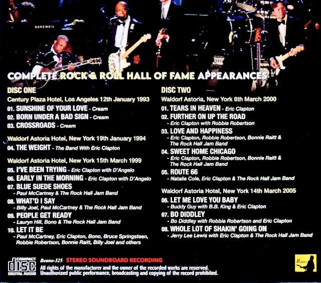 This compilation is a treat for rock fans, featuring a complete stereo soundboard recording of Eric Clapton’s performance at the Rock and Roll Hall of Fame! The Rock and Roll Hall of Fame is considered the most prestigious honor in America, comparable to the Academy Awards in the film industry. In addition to fan votes on the official website, inductees are selected by over 1,200 artists, music industry professionals, and experts. Being inducted into the Hall of Fame is the highest honor for any musician or artist, signifying that their career has been recognized and celebrated by the entire music world. While many musicians have been inducted into the Hall of Fame, Eric Clapton is etched in the history of Western music as the only artist to have been inducted three times (with the Yardbirds, Cream, and as a solo artist). The Rock and Roll Hall of Fame induction ceremony takes place at the beginning of each year, between January and March, and several selected artists are awarded this prestigious title. At the awards ceremony, the inducted artists naturally give exemplary performances, but it’s also common for presenters and fellow artists who have come to offer their congratulations to perform celebratory pieces. This time, the master recordings, provided by a veteran taper residing in the UK—a familiar source for Clapton’s rare recordings—comprehensively capture all of Clapton’s performances at the Rock and Roll Hall of Fame between 1993 and 2005 in stereo soundboard recordings. Of course, it includes the Cream reunion performance for which Clapton received the award, but what’s particularly interesting is that it also includes all of his performances participating in celebratory performances for other Hall of Fame artists with whom he had close ties. Some of these are artists he would never normally collaborate with. Personally, compiling this kind of audio data is an extremely laborious task, so this is fascinating content that Clapton fans, as well as fans of the artists he has collaborated with, shouldn’t miss. Some of the notable artists featured include The Band, Paul McCartney, Robbie Robertson, Billy Joel, Bruce Springsteen, Bono, Bonnie Raitt, Buddy Guy, B.B. King, Bo Diddley, Jerry Lee Lewis, and D’Angelo, who sadly passed away last year at a young age. You can’t help but wonder what it would be like to hear Clapton and Paul, or Clapton and Springsteen, perform together. The sound quality is on par with official stereo soundboard recordings, so you can enjoy it with peace of mind. Considering Clapton’s humble personality, he’s not the type to constantly hog the spotlight and play solos, but thanks to the superb direction of Paul Shaffer, the awards ceremony’s musical director, the large group performance doesn’t become chaotic or messy, and Clapton’s solos are well-placed, making this a compilation full of highlights. Main highlights First up is Cream’s performance from 1993. That year, Cream’s achievements were recognized, and they were inducted into the Rock and Roll Hall of Fame. It was their first reunion in 25 years since their breakup in 1968. A rehearsal was held the day before, and the three songs to be performed at the commemorative concert were decided before the main event. In a way, it makes sense that they chose these three songs from their extensive repertoire. Ginger’s drumming is a little sluggish on “Crossroads,” but considering it was their first reunion in 25 years, their performance was still impressive. The recipient of the award the following year, 1994, was The Band. It would have been great if all the original members had been able to gather, but the feud between Robbie Robertson and Levon Helm, which was one of the causes of the band’s breakup, continued, and Levon did not participate in this performance. The other members were present, with Anton Fig on drums. Eric Clapton, who had always admired The Band, was very keen to participate. Clapton not only played a guitar solo but also sang vocals. While Rick Danko’s vocals show noticeable signs of decline, their first collaboration in 18 years since “The Last Waltz” in 1976 is undeniably moving. In 1999, Billy Joel, Paul McCartney, and Bruce Springsteen received the award. Songs related to them were performed together, and that year Clapton’s revered late Curtis Mayfield also received the award, which is why Clapton rushed to offer his congratulations. This explains his performances with D’Angelo and his participation in “People Get Ready.” Clapton also joined the joint performance, where he collaborated with Billy Joel, Paul McCartney, and Bruce Springsteen. “Let It Be,” a song Paul always performs at these events, is definitely worth listening to in this lineup. In 2000, Eric Clapton received the award as a solo artist, as did Bonnie Raitt. As blues musicians were among the recipients, many classic blues numbers were played. The collaboration between Clapton and Robbie Robertson here is a must-listen, and his performance with the renowned Black singer Natalie Cole on Route 66 is also brilliantly understated. In 2005, Buddy Guy, a Black blues guitarist whom Clapton greatly admired, received the award. Clapton must have been delighted. While he has collaborated with Guy many times in the past, this collaboration with B.B. King must have been particularly memorable. It’s also noteworthy that Bo Diddley and Jerry Lee Lewis joined them, clearly demonstrating that rock and roll and blues share the same roots. The 2CD set comprehensively covers Clapton’s historic collaborations with these great artists. While the recordings themselves are well worth listening to, I hope you will also appreciate Clapton’s stance of never being overbearing in these settings, but instead delivering precise and accurate performances. Disc:1 (45:43) Century Plaza Hotel, Los Angeles 12th January 1993 1. Sunshine Of Your Love – Cream 2. Born Under A Bad Sign – Cr