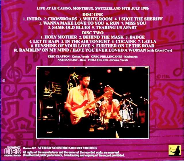 We’ve acquired a stereo soundboard 1st generation master recording of the 1986 Montreux Jazz Festival! The well-known UK-based heavyweight taper has provided us with a stereo soundboard 1st generation master recording of Eric Clapton’s July 10th performance at the 1986 Montreux Jazz Festival! This recording has previously been released on various labels, and official footage of the performance has also been released, demonstrating the exceptional sound quality and performance content of this performance. The bootleg rating site “Geetarz” has given the most outstanding title of this day’s bootleg the highest score of “SB6,” demonstrating the perfect sound quality. While the heavyweight taper’s master recording is undoubtedly leaked from an official source, this digital copy of the 1st generation master is clearly at “SB6+” level. The sound quality and sound balance are truly official-grade—indeed, even better. There are many titles that we have released this year, such as “Roskilde 1986 Soundboard”, “Antibes 1986”, and “Birmingham 1986 2nd Night: Multitrack Master”, but we can confidently say that this work will definitely join the representative titles of the 1986 tour. A precious stage from the early days of the AUGUST tour Let’s review Clapton’s activities this year from the recording of the album “AUGUST”, which was the basis of this tour. They were as follows. February 23, 1986: Appeared at the memorial concert for the late Ian Stewart (the sixth member of the Rolling Stones) held at London’s “100 Club”. February 25, 1986: Presented the “Lifetime Achievement Award” to the Rolling Stones at the “Grammy Awards” ceremony broadcast live from London’s Kensington Roof Gardens Club. April-May 1986: Recording of the album “AUGUST” April 6, 1986: Made a surprise appearance at Comedy Aid in London June 20, 1986: Appeared at the Prince’s Trust 10th Anniversary Concert at Wembley Arena in London July 3-15, 1986: Undertook a short tour to perform at jazz festivals in Europe ←★Here★ August 14, 1986: Jammed with Prince at Kensington Roof Gardens in London August 15, 1986: Appeared at a charity event at Finchley Cricket Club in England and jammed with Stan Webb of Chicken Shack August 15, 1986: Recorded a new song, “Tearing Us,” at Ronnie Scott’s, a club in London Filmed the promotional clip for “Apart” (a stand-in was used for the role of Tina Turner, who duets in the studio version). August 27th and 28th, 1986: Recorded the soundtrack album with Bob Dylan, who had come to the UK at short notice, at Townhouse Studios in London. September 1986: Recorded “It’s In The Way That You Use” for the soundtrack of the film “The Hustlers 2.” Recorded “It” (this song was eventually included on the album “AUGUST”). October 1, 1986: Released the album “AUGUST”. October 16, 1986: Appeared at the Chuck Berry 60th Birthday Celebration Concert at the Fox Theater in St. Louis, USA (this performance was filmed and used in the Berry biopic directed by Keith Richards). October 27, 1986: Made a surprise appearance at Lionel Richie’s concert at Madison Square Garden in New York, USA. October 29, 1986: Appeared on the music program “Nightlife” at the NBC Television Studios in New York, USA. November 8, 1986: Appeared at a Robert Cray gig at the Mean Fiddler club in London. November 20 and 21, 1986: Appeared at the Metro club in Boston, USA. November 23 and 24, 1986: Appeared at a special gig at the Ritz club in New York, USA (Keith Richards of the Rolling Stones made a surprise appearance on the 23rd). December 8-16, 1986: Recorded the soundtrack for the film Lethal Weapon at Townhouse Studios in London. December 23, 1986: Appeared at a Gary Brooker charity concert at Village Hall in Dunsfold, Surrey, UK. It was a busy year, featuring numerous performances at events, including charity events. The year before, Clapton spent time in Los Angeles doing additional sessions for the release of his album “Behind the Sun.” There, he met and bonded with the local session musicians known as “Team A,” Nathan East (bass) and Greg Phillinganes (keyboards). He parted ways with his previous support band and invited them to record his new album. As with his previous album, he tapped his friend, musician Phil Collins, as producer, and recorded at Sunset Sound Studios in Los Angeles. Clapton was in high spirits, so songs flowed, and recording was completed in just two weeks. Eager to play with his new bandmates, Clapton embarked on a short tour of European jazz festivals in July, even before the album’s release. The only other times he toured with a setlist featuring new songs before an album release were during his comeback tour in 1974 and his Japan tour in 1977. Clapton must have been itching to perform these new songs. The six tracks from the new album included “Wanna Make Love To You” (which was ultimately removed from the album in favor of “It’s In The Way That You Use It”), “Run,” “Miss You,” “Tearing Us Apart,” “Holy Mother,” and “Behind the Mask.” Inspired by the dynamics of these two Black musicians, Clapton also delivered a bang. Interestingly, under their influence, the new songs and his previous hits took on a Black contemporary flair. East’s fusion-inspired playing, complete with chopper technique, and Phillinganes’ extensive use of jazzy chords and synths breathed new life into Clapton’s compositions. The set, which began with his signature “Crossroads,” was fresh and Clapton’s enthusiasm was palpable. “White Room” and “I Shot the Sheriff” were also superb. “Same Old Blues” was a much longer version, significantly expanded from the previous year’s performance. According to Clapton, East and Phillinganes were from jazz and fusion backgrounds, lacking a background in primitive blues. Performing this song clearly changed their awareness of their roots. This m