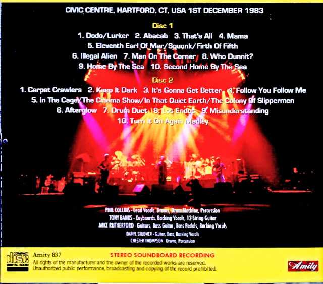 This newly discovered stereo soundboard recording captures the December 1st performance in Hartford, North America, from the “THE MAMA Tour” accompanying the 1983 release of “GENESIS.” This first-of-its-kind recording, also released extensively in recent years, is a direct recording from the mix master, also leaked by insiders. The unprocessed sound is incredibly realistic, clearly reproducing even the subtle nuances of the band ensemble. It perfectly recreates the day’s performance over the course of 2 hours and 29 minutes. While the official “THE MAMA TOUR” footage also exists, this one is 47 minutes longer than the 1 hour and 42 minute version, and boasts a significantly larger track count. The eight tracks not included on the official releases, including a highlights medley, make this a must-listen for anyone wanting to get a full view of the tour. Live at Civic Center, Hartford, CT, USA 1st December 1983 : Stereo Soundboard Recording Disc 1 : 1. Dodo/Lurker 2. Abacab 3. That’s All 4. Mama 5. Medley: Eleventh Earl of Mar/Squonk/Firth of Fifth 6. Illegal Alien 7. Man on the Corner 8. Who Dunnit? 9. Home by the Sea 10. Second Home by the Sea Disc 2 : 1. Carpet Crawlers 2. Keep it Dark 3. It’s Gonna Get Better 4. Follow You Follow Me 5. Medley: In the Cage/The Cinema Show/In That Quiet Earth/The Colony of Slippermen 6. Afterglow 7. Drum Duet 8. Los Endos 9. Misunderstanding 10. Turn it on Again Medley Phil Collins – Vocals, Drums & Percussion / Mike Rutherford – Bass & Guitar / Tony Banks – Keyboards / Chester Thompson – Drums & Percussion / Daryl Steurmer – Guitar