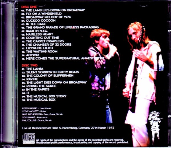“THE LAMB LIES DOWN ON BROADWAY TOUR” is the biggest story tour in progressive rock history. We have prepared another masterpiece live album born from the excavation site of “Broadway Audience”. What is recorded in this work is “March 27, 1975 Nuremberg performance”. This is an exquisite audience recording. “ANNECY 1975” and “MUNICH 1975” are also released at once. In order to understand the mutual relationship, let’s organize the collection by narrowing the focus to the European tour at the time.・February 19th – March 22nd (17 performances) ・March 22nd “ANNECY 1975” ・March 24th + 26th (2 performances) ・March 27th: Nuremberg performance ←★This work★ ・March 29th – April 3rd (5 performances) / April 4th “MUNICH 1975” / April 5th – April 12th (7 performances) / April 14th “WEMBLEY 1975 1ST NIGHT: MASTER TAPES” / 4 April 15th: London performance April 16th “SOUTHAMPTON 1975” April 18th: Liverpool performance April 19th “DEFINITIVE LIVERPOOL 1975” April 20th – May 24th (24 performances) This is the main commentary A close-up of “Europe #1 → UK → Europe #2”. Until now, there have been many British recordings, such as the main volume “SOUTHAMPTON 1975” and the iconic soundboard “DEFINITIVE LIVERPOOL 1975,” but now masterpiece recordings from continental Europe such as West Germany and France are also seeing the light of day one after another. is. This work is also quite a masterpiece. The best thing about it is its sound. The strength of the core is transferred to the main press 2CD, but the beauty of the neat sound, the vivid details down to the subtleties, the crystal clear atmosphere… and the indescribable sense of fantasy that these combine to create. In fact, it was not released as an independent release because the beginning of the opening “The Lamb Lies Down on Broadway” was missing and the encore “The Musical Box” was incomplete, but the basic quality is It is a beautiful recording that can be kept permanently. “Dazzling Broadway” is a monumental story album that British rock is proud of. Unlike “Tommy” and “The Wall”, there is no hope of other media distribution or re-performances, and the only way to experience it live is to rely on the live albums of the time. Messezentrum Halle A, Nuremberg, Germany 27th March 1975 TRULY AMAZING/PERFECT SOUND Disc 1(65:29) 01. The Lamb Lies Down On Broadway 02. Fly On A Windshield 03. Broadway Melody Of 1974 04. Cuckoo Cocoon 05. In The Cage 06. The Grand Parade Of Lifeless Packaging 07. Back In N.Y.C. 08. Hairless Heart 09. Counting Out Time 10. The Carpet Crawlers 11. The Chamber Of 32 Doors 12. Lilywhite Lilith 13. The Waiting Room 14. Anyway 15. Here Comes The Supernatural Anaesthetist Disc 2(40:37) 01. The Lamia 02. Silent Sorrow In Empty Boats 03. The Colony Of Slippermen 04. Ravine 05. The Light Dies Down On Broadway 06. Riding The Scree 07. In The Rapids 08 . It 09. The Musical Box Story 10. The Musical Box
