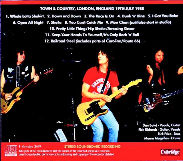 The Georgia Satellites of 1988, riding the momentum of their shocking debut, slammed the world with “OPEN ALL NIGHT.” Here comes a soundboard album that will ingrain that scorching live performance into your brain. This work was recorded at the “London performance on July 19, 1988.” It’s a superb stereo soundboard recording. Speaking of the “OPEN ALL NIGHT Tour,” the official excavated live album “LIGHTNIN’ IN A BOTTLE” is still fresh in our memory, but of course (?) this work is a different performance. To understand the situation, let’s first take a look at the schedule and overview of their activities at the time. April 8th + 10th: North America #1 (2 shows); May 27th – June 21st: North America #2 (13 shows) (June “OPEN ALL NIGHT” release); June 25th – July 19th: Europe (14 shows) ←★here★; July 31st – December 18th: North America #3 (27 shows) ←※Official. This is the latest official excavation master from THE GEORGIA SATELLITES in 1989. This London performance was the final day of the “European” leg, the month after the album’s release. The official “LIGHTNIN’ IN A BOTTLE” was recorded in Cleveland in December, about five months before that. This show is also known for being broadcast on radio, and this work is the pinnacle of such FM soundboards. This is the air check master from that time, which was only recently released, and it’s incredibly amazing. Since it’s Master Direct, there are no dubbing marks, no noticeable reception disturbances or tape twist, and no sign of aging on the master. While the mix has the vividness of a broadcast, the sound quality itself feels natural even when mixed with the official “LIGHTNIN’ IN A BOTTLE” release. A treasure trove of repertoire not heard on the official release. This completely official sound portrays a live performance not unlike “LIGHTNIN’ IN A BOTTLE.” While the editing, which conforms to the broadcast timeframe of just under an hour, falls short of “LIGHTNIN’ IN A BOTTLE,” it also includes plenty of repertoire not heard on that masterpiece. Let’s organize the sets by comparing them here. Open All Night (6 songs), Whole Lotta Shakin’, Down and Down, Dunk ‘n’ Dine (★), Open All Night, Sheila, Mon Cheri, and others (6 songs + α), Georgia Satellites: Keep Your Hands To Yourself (It’s Only Rock ‘n’ Roll) / Railroad Steel (Route 66), Other covers: The Race Is On (★), I Got You Babe (★), You Can’t Catch Me (★), Medley (★: Pretty Little Thing, Hip Shake, Amazing Grace) *Note: * indicates songs not heard on the official “LIGHTNIN’ IN A BOTTLE” album. …And so it goes. While the “OPEN ALL NIGHT” numbers, which make up about half of the album, remain the core, they also perform “Dunk ‘n’ Dine,” which isn’t on “LIGHTNIN’ IN A BOTTLE.” Even more colorful are the supporting covers. This album is so diverse that it could be said to have been completely replaced, even including the standard “Route 66” on “Railroad Steel” and a riff from STATUS QUO’s “Caroline” (perhaps a special treat for a UK performance). This superb live album also serves as the “UK edition of LIGHTNIN’ IN A BOTTLE.” Boasting sound quality comparable to the excellent official releases, it offers a more diverse repertoire with less overlap. This new masterpiece is highly recommended for both fans of the official albums and those experiencing THE GEORGIA SATELLITES in their prime for the first time. This superb stereo soundboard recording of the “London performance on July 19, 1988” is a recently released, top-notch updated master. While the mix has a lively broadcast vibe, the sound quality itself blends seamlessly with the official “LIGHTNIN’ IN A BOTTLE” release. It also features a variety of covers, including “Dunk ‘n’ Dine,” a track not included on the official release. This must-listen live album also serves as the “UK version of LIGHTNIN’ IN A BOTTLE.” Town & Country, London, England, July 19, 1988, STEREO SBD (59:15) 1. Whole Lotta Shakin’ 2. Down and Down 3. The Race Is On 4. Dunk ‘n’ Dine 5. I Got You Babe 6. Open All Night 7. Sheila 8. You Can’t Catch Me 9. Mon Cheri 10. Pretty Little Thing / Hip Shake / Amazing Grace 11. Keep Your Hands To Yourself / It’s Only Rock ‘n’ Roll 12. Railroad Steel (includes parts of Caroline / Route 66) Dan Baird – vocals, guitar Rick Richards – guitar, vocals Rick Price – bass Mauro Magellan – drums STEREO SOUNDBOARD RECORDING