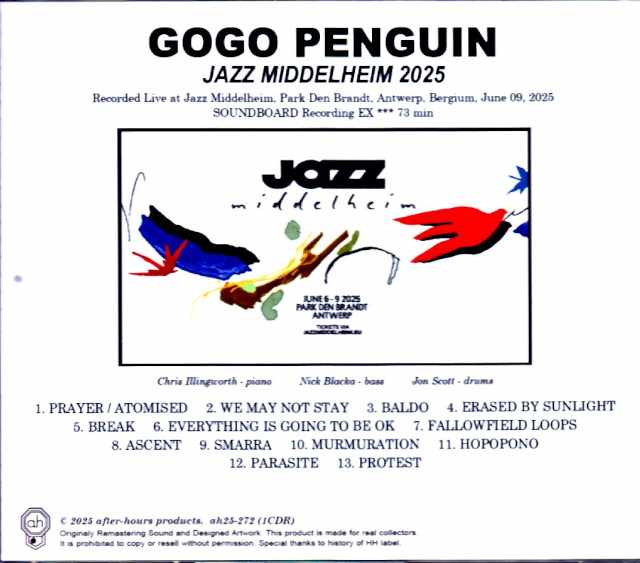 GoGo Penguin, a new generation piano trio with a wide appeal across genres, has evolved at a speed faster than fans could have imagined, becoming bolder, more complex, more intricate, and more ambient. This latest live performance, full of infinite possibilities and full of emotion, is now available in the highest quality, complete edition! This album replaces original drummer Rob Turner, known for his mechanically precise technique, but unlike Rob, known for supporting the legendary Ethiopian drummer Mulatu Astatke, John Scott, who, while possessing top-notch technique, is more aggressive and powerful, placing a greater emphasis on live performances. The release of this album marks the band’s second album since joining the band, “Necessary Fictions,” and coincides with the release of the band’s second album, “Necessary Fictions.” While the band’s March solo tour of Tokyo and Yokohama is still lingering, just like the Jan Garbarek album we recently received (the day before), this album features a superb live performance, including tracks from their latest album, just performed at the Jazz Middelheim Festival in Antwerp, Belgium on June 9, 2025, recorded in its entirety on an ultra-high-quality stereo soundboard with meticulous mastering by the label itself. A must-listen for all music fans!!! GoGo Penguin’s music is based on a European, classical background, the progressive sensibilities of techno pioneers Ashura (Temple), Manuel Göttsching, and Klaus Schulze, the rhythmic uplift of techno and house, drum ‘n’ bass, dubstep, jazz, and even contemporary music, minimalism like Eno, and ambient music like the late Ryuichi Sakamoto and the much-anticipated Tigran Hamasyan. It also includes influences from rock acts like Ladyhead and Massive Attack. They’re simply an incredibly cool band! From a well-known Japanese critic to cutting-edge musicians with sharp, refined skills, they’re garnering attention from connoisseurs as one of the most sought-after groups to see live. If you’re wondering whether they can perform such flawless programming live, this live album will leave you speechless and amazed. Starting with sketches created in sequencing software, the band’s creative process is more like that of a trackmaker than a musician. They assemble complex phrases via laptop, unearthing complexities that would be impossible to come up with through a regular studio session. Tracing these into a piano trio format, they create a dynamic unattainable through programming. They also incorporate improvisation, effortlessly orchestrating a seamless ensemble with a level of technique that seems almost impossible for a human to achieve. They then perform this live, showcasing each member’s skill and vast repertoire. Meanwhile, as the band members have stated, “we don’t use technique for technique’s sake,” their honed ensemble is underpinned by a minimalist aesthetic, focusing on the possibilities of live performance and completely eschewing the use of programmed instruments. Even the finer details, from the human-powered drum & bass to the glitchy noises at the end of each performance, are recreated live. While there are occasional moments that sound like the needle skips, that’s just how the performance is. It’s no exaggeration to say that this rhythm section is at the pinnacle of excellence. John’s virtuoso technique is as precise as a machine, and his wildness, emphasizing the live feel, makes it impossible to stop listening… And what’s even more exciting is the superb sound quality, revealing every last detail of the drums! The technique and playing style of the drums and bass have grown immensely in recent years compared to the other instruments, and Nick and John’s playing has evolved even further since their Japan performance three months ago! Meanwhile, Chris, the pillar of Penguin, plays piano at its finest. His lyrical and romantic playing seems to strike the heartstrings directly! GoGo Penguin, which emerged to replace E.S.T., whose history came to an end with the death of Esbjörn Svensson, is the piano trio, or rather, the music, you should be listening to right now!