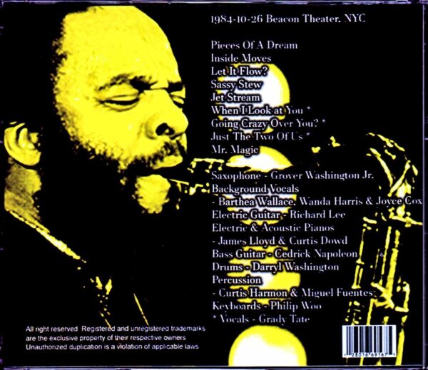 A live performance where you can enjoy the first-class jazz fusion of Quiet Storm’s leading man, Grover Washington Jr., is now available as a soundboard recording! Beacon Theater on October 26, 1984. It was around the time when the masterpiece Inside Moves was released, and there are many songs from there, but the thrill of the hard-core fusion Jet Stream is still the best. Although it’s not Bill Withers’ vocals, Grady Tate’s masterpiece Just The Two Of Us is captivating, When I Look At You has Philip Wu’s oxidized silver keyboard, and Mr. Magic’s killer, which is often used as a hip-hop joke. It’s a masterpiece full of charm, right down to the performance. 1984-10-26 Beacon Theater, NYC Pieces Of A Dream Inside Moves Let It Flow? Sassy Stew Jet Stream When I Look at You * Going Crazy Over You? * Just The Two Of Us * Mr. Magic Saxophone – Grover Washington Jr. Background Vocals – Barthea Wallace, Wanda Harris & Joyce Cox Electric Guitar – Richard Lee Electric & Acoustic Pianos – James Lloyd & Curtis Dowd Bass Guitar – Cedrick Napoleon Drums – Darryl Washington Percussion – Curtis Harmon & Miguel Fuentes Keyboards – Philip Woo * Vocals – Grady Tate