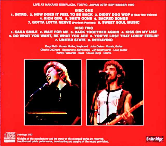 This release features a full 1 hour and 23 minute recording of the September 30th show at Nakano Sun Plaza in Tokyo, the second day of their Japan tour that autumn, which came just six months after their legendary first visit following the release of 1980’s “X-STATIC.” The recording was made from a remarkably good audience master recently released by a taper. Following their first visit in February of that year, “VOICES” was released in July and became a worldwide hit, prompting their second visit. Incidentally, while their Shibuya performance from that tour was broadcast on FM, this release naturally includes three songs that were not aired on the radio, which is a major highlight. The live performance, featuring representative songs from the 70s up to the album “VOICES,” including “Kiss On My List” and “You’ve Lost That Lovin’ Feelin'”—songs that would later become staples—is a precious record of a live performance in Japan just before their record-breaking breakthrough with “Private Eyes” a year later. It’s a must-listen memorial item for fans who remember that time. Live at Nakano Sunplaza, Tokyo, Japan 30th September 1980 : from Original Masters Disc 1 : 1. Intro 2. How Does It Feel to Be Back 3. Diddy Doo Wop (I Hear the Voices) 4. Rich Girl 5. She’s Gone 6. Sacred Songs 7. Gotta Lotta Nerve (Perfect Perfect) 8. Sweet Soul Music Disc 2 : 1. Sara Smile 2. Wait for Me 3. Back Together Again 4. Kiss on My List 5. Do What You Want, Be What You Are 6. You’ve Lost That Lovin’ Feelin’ 7. United State 8. Intravino Daryl Hall – Vocals, Keyboards / John Oates – Vocals, Guitars / Charlie DeChant – Saxophone, Keyboards / Jeff Southworth – Guitar / Kenny Passarelli – Bass / Chuck Burgi – Drums