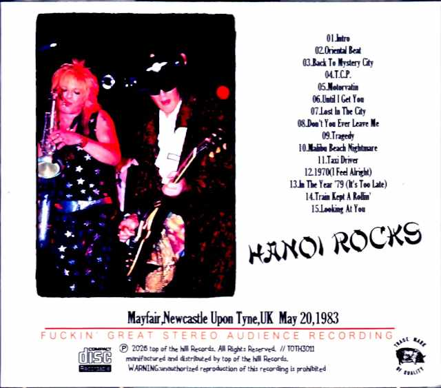 A rare recording has emerged from the Newcastle show during the tour accompanying the release of their fourth album, “BACK TO THE MYSTERY CITY,” captured in excellent stereo audience recording quality! This rare recording captures a live performance held on May 20, 1983, in Newcastle, in northeastern England, during the tour that followed their first visit to Japan in support of their fourth album, “BACK TO THE MYSTERY CITY,” and is captured in excellent stereo audience recording quality! Remastered from a low-generation master, the sound image is somewhat rough, but each part, including the vocals, is well-balanced, and the recording captures the powerful sound of the floor with Andy & Nasty’s guitars resonating loudly, resulting in an outstanding sound quality. The setlist includes the opening sound effect, three songs from their then-new album “BACK TO THE MYSTERY CITY” (including the singles “Malibu Beach Nightmare” and “Until I Get You”), “Don’t You Ever Leave Me” from their debut album (which was re-recorded and rearranged and released as a single the following year), the heavy blues number “Taxi Driver” from their third album, and the rare track “In The Year ’79 (aka. It’s Too Late)” written around 1979 before the band was formed. The setlist also includes covers of The Boys’ “T.C.P.”, The Stooges’ “1970,” the rock and roll classic “Train Kept A Rollin'” (known for The Yardbirds and Johnny Burnette), and finally, a rare cover of MC5’s “Looking At You,” allowing you to fully enjoy a powerful and incredible performance! Mayfair,Newcastle Upon Tyne,UK May 20,1983 01.Intro 02.Oriental Beat 03.Back To Mystery City 04.T.C.P. 05.Motorvatin 06.Until I Get You 07.Lost In The City 08.Don’t You Ever Leave Me 09.Tragedy 10.Malibu Beach Nightmare 11.Taxi Driver 12.1970(I Feel Alright) 13.In The Year ’79 (It’s Too Late) 14.Train Kept A Rollin’ 15.Looking At You