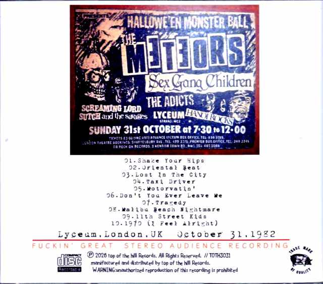 A previously unreleased recording of a London concert held at the time of the release of their third album, “Self Destruction Blues,” has been newly remastered! This previously unreleased recording captures a live performance held on October 31, 1982, shortly after the release of their third album, “Self Destruction Blues,” at the Lyceum Ballroom in Westminster, London, which has a capacity of approximately 2100 people. The recording was captured in excellent stereo audience quality! Remastered from a low-generation master, the sound image is somewhat rough, but each part, including the vocals, is well-balanced, and the recording captures the powerful sound of the floor with Andy & Nasty’s guitars resonating loudly. Furthermore, the significant pitch and positional discrepancies caused by the master have been carefully corrected. This live performance took place shortly after the band replaced drummer Zip Casino with Razzle. With Razzle on drums and Michael on vocals and harmonica, the show opened with Slim Harpo’s “Shake Your Hips,” also known for its Rolling Stones cover. Only “Taxi Driver” was selected from their then-new album, “Self Destruction Blues,” and the setlist mainly consisted of songs from their first and second albums, such as “Don’t You Ever Leave Me” and “Oriental Beat,” before closing with a cover of The Stooges’ “1970”! And don’t miss their performance of “Malibu Beach Nightmare,” which was included on the first album on which Razzle played drums and was released as a single on “BACK TO THE MYSTERY CITY” the following year! Lyceum Ballroom,London,UK October 31,1982 01.Shake Your Hips (intro) 02.Oriental Beat 03.Lost In The City 04.Taxi Driver 05.Motorvatin’ 06.Don’t You Ever Leave Me 07.Tragedy 08.Malibu Beach Nightmare 09.11th Street Kids 10.1970 (I Feel Alright)