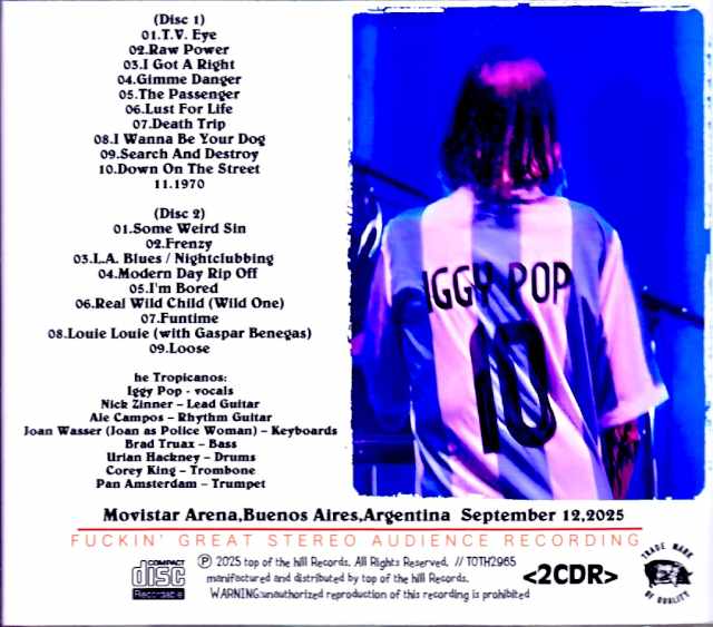 This high-quality digital PCM stereo audience recording captures the latest performance from Iggy Pop’s latest tour in Buenos Aires, Argentina, as he reaches the final stretch of his career! Following his miraculous visit to Japan in April 2025, where his newly recorded version of “The Passenger” in collaboration with Siouxsie Sioux was used in a commercial, Iggy Pop’s latest live performance has arrived! This high-quality stereo audience recording captures the entire live performance held at the 15,000-capacity Movistar Arena in Buenos Aires, Argentina, on September 17, 2025! Directly digitally transferred from the digital PCM master, the vocals are crisp and clear, with each part exceptionally well-balanced and deep, providing a clear sound quality. The concert features Yeah Yeah Yeahs guitarist Nick Zinner, The Armed drummer Julia Hickney, keyboardist Joan Wasser (who replaces Seamus Begen as Joan as Police Woman), and the Tropicanos, a stellar horn section featuring trombone and trumpet. The setlist, which opened with “T.V. Eye” as they did in their April Japan tour, spans a career spanning Stooges hits like “I Got a Right,” performed for the first time since 2003, and “1970,” also performed for the first time since 1989, as well as tracks from their latest album, “Every Loser.” Argentine musician Gaspar Venegas joins on guitar for “Louie Louie.” Experience a powerful and stunning solo performance at a large arena with stunning sound! Movistar Arena,Buenos Aires,Argentina September 12,2025 (Disc 1) 01.T.V. Eye 02.Raw Power 03.I Got A Right 04.Gimme Danger 05.The Passenger 06.Lust For Life 07.Death Trip 08.I Wanna Be Your Dog 09.Search And Destroy 10.Down On The Street 11.1970 (Disc 2) 01.Some Weird Sin 02.Frenzy 03.L.A. Blues / Nightclubbing 04.Modern Day Rip Off 05.I’m Bored 06.Real Wild Child (Wild One) 07.Funtime 08.Louie Louie (with Gaspar Benegas) 09.Loose The Tropicanos: Iggy Pop – vocals Nick Zinner – Lead Guitar Ale Campos – Rhythm Guitar Joan Wasser (Joan as Police Woman) – Keyboards Brad Truax – Bass Urian Hackney – Drums Corey King – Trombone Pan Amsterdam – Trumpet