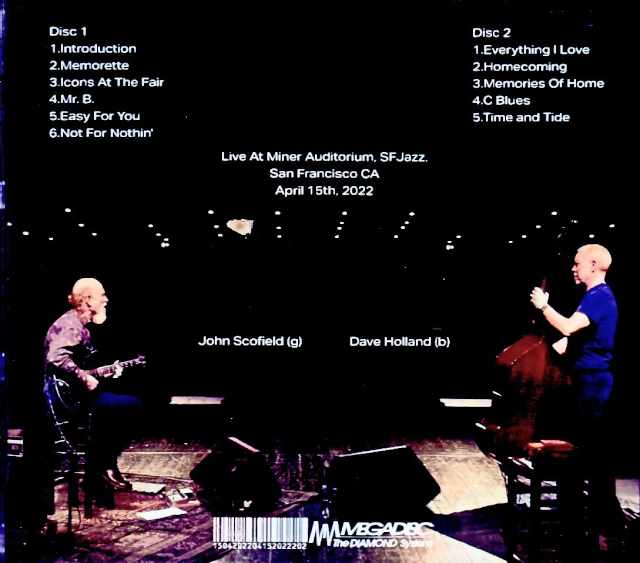This highly sought-after album captures the entirety of a live performance held at the SF Jazz Center in San Francisco in 2022, featuring the first duo album “Memories of Home” by bass legend Dave Holland, with whom Scofield has collaborated in various forms in the past. Scofield has traversed a wide range of styles, from his time in Miles Davis’s band to post-bop, fusion, funk, and jazz-rock. Dave Holland, who rose to prominence as a member of Miles Davis’s golden age, has since left behind a diverse body of work as a leader in duos, trios, and big bands, showcasing his free and powerful rhythm in a wide range of formats. This performance features a selection of songs and approaches that reflect the broad musicality of Scofield and Holland. The setlist includes both their own compositions and tributes to jazz classics, allowing listeners to enjoy the thrill of improvisation and traditional jazz elements simultaneously. Live At Miner Auditorium, SFJazz, San Francisco CA April 15th, 2022 Disc 1 1.Introduction 2.Memorette 3.Icons At The Fair 4.Mr.B 5.Easy For You 6.Not For Nothin’ Disc 2 1.Everything I Love 2.Homecoming 3.Memories Of Home 4.C Blues 5.Time and Tide John Scofield(g) Dave Holland(b)