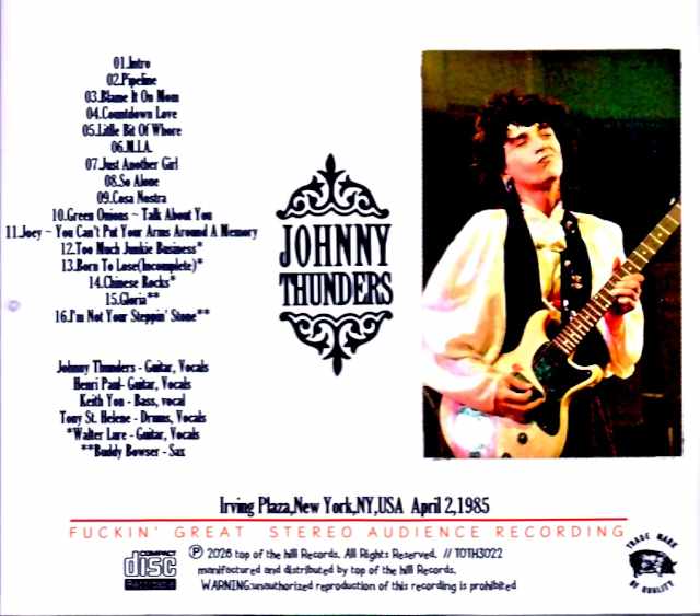 This release captures a high-quality stereo audience recording of a New York performance by the Black Cats, featuring Henry Paul on rhythm guitar alongside the Black rhythm section from the “QUE SERA SERA” recording sessions, with Walter Lure making a surprise appearance! After completing his Japan tour from late January to February 1985, Johnny returned to New York and performed consecutive shows at Irving Plaza on April 1, 2, 3, 8, and 13. The first night featured guest appearances by his Dolls bandmates David Johansen and Arthur Kane, while the final night, with guest appearances by Richard Hell, Sylvain Sylvain, and Walter Lure, can be heard on the label’s previously released album “IRVING PLAZA 85.” This release captures the second night, April 2, 1985, in a high-quality stereo audience recording! Recorded from a low-generation master, it boasts a wide dynamic range, excellent balance in both vocals and other parts, and Johnny’s guitar, roaring and resonating throughout the floor, is captured with incredible power and clarity. This live recording features Johnny Depp’s lineup from the time of the album “QUE SERA SERA” release, with the Black rhythm section Keith Jong & Tony St. Helen and Henry Paul on side guitar. The recording starts with the opening sound effect of “The Man with the Golden Arm,” and the setlist features “Blame It On Mom,” “Little Bit Of Whore,” and “M.I.A.” from the then-new album “QUE SERA SERA.” In the middle, Johnny Depp performs an acoustic solo set of “Joey” ~ “You Can’t Put Your Arms Around A Memory,” but it only lasts a few seconds (lol). However, Walter Lure makes a surprise appearance! They play Heartbreakers killer tunes “Too Much Junkie Business,” “Born To Lose,” and “Chinese Rocks”! Furthermore, the encore includes a cover session with Buddy Bowser on saxophone, making this a powerful recording that you can fully enjoy! Irving Plaza,New York,NY,USA April 2,1985 01.Intro02.Pipeline 03.Blame It On Mom 04.Countdown Love 05.Litlle Bit Of Whore 06.M.I.A. 07.Just Another Girl 08.So Alone 09.Cosa Nostra 10.Green Onions ~ Talk About You 11.Joey ~ You Can’t Put Your Arms Around A Memory 12.Too Much Junkie Business* 13.Born To Lose(Incomplete)* 14.Chinese Rocks* 15.Gloria** 16.I’m Not Your Steppin’ Stone** Johnny Thunders – Guitar, Vocals Henri Paul- Guitar, Vocals Keith Yon – Bass, vocal Tony St. Helene – Drums, Vocals *Walter Lure