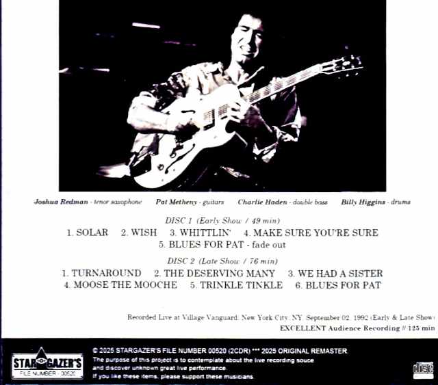This recording features Joshua Redman’s quartet. Featuring virtuosos like Pat Metheny, Charlie Haden, and Billy Higgins, the venue is the Village Vanguard, home to countless legendary live albums. The audience recording is immersive and high-quality. There’s nothing to complain about. Oh, the only flaw is that the early show on Disc 1 is cut off slightly at the end, forcing a fade-out. But that’s it. Recorded Live at Village Vanguard, New York City, NY, September 02, 1992 (Early & Late Show) EXCELLENT Audience Recording // 125 min DISC 1 (Early Show / 49 min) 1. SOLAR 2. WISH 3. WHITTLIN’ 4. MAKE SURE YOU’RE SURE 5. BLUES FOR PAT – fade out DISC 2 (Late Show / 76 min) 1. TURNAROUND 2. THE DESERVING MANY 3. WE HAD A SISTER 4. MOOSE THE MOOCHE 5. TRINKLE TINKLE 6. BLUES FOR PAT Joshua Redman – tenor saxophone Pat Metheny – guitars Charlie Haden – double bass Billy Higgins – drums