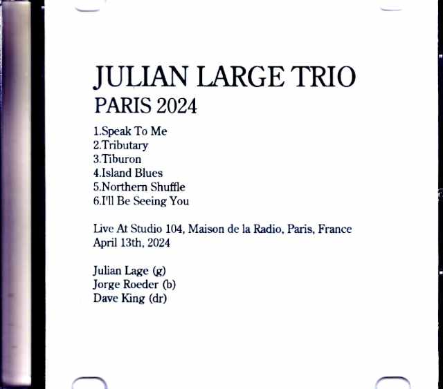 Starting with joining Gary Burton’s group in his teens, he has performed with big names such as Charles Lloyd and John Zorn, while steadily building his solo career. In addition to the traditions of jazz, his style is also influenced by old American music such as blues and country, and is supported by a wide range of music fans. This is a recording of a public live performance by Julian Lage, a guitarist representing the 21st century, recorded in April 2024 for broadcast at Studio 104 in Paris, with official quality sound and about an hour long. In addition, the members have been renewed, and Dave King of Bad Plus will be on drums, and they will be captivating with new developments. Live at Studio 104, Radio France, Paris, France 04/13/2024 1.Speak To Me 2.Tributary 3.Tiburon 4.Island Blues 5.Northern Shuffle 6.I’ll Be Seeing You Julian Lage (g) Jorge Roeder (b) David King (dr)