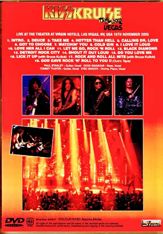 The limited-edition revival event “KISS KRUISE: Land-Locked in Vegas” garnered worldwide attention. This multi-camera film captures the entire show, from start to finish. This film was, of course, shot at the Virgin Hotels Las Vegas on November 15, 2025. The multi-camera audience witnessed the entire event. “KISS KRUISE: Land-Locked in Vegas” took place over two days, with a short acoustic gig on the first day and a full electric concert on the second. While a single-camera audience recording of both days was well-received, this film is something entirely different. It’s a multi-camera edited film that captures the main two-day electric concert. What’s astounding is the incredible quality. While there are only three angles, each one is incredibly high-quality. Let’s take a look at the unique characteristics of the three cameras. Camera 1 (medium distance from the front): A mid-distance shot looking directly at the stage. It’s far enough away to capture the entire stage, but it also passes far above the audience in the front, offering a spectacular, unobstructed view straight onto the stage. Zooming in from there brings each member close enough to fill the frame. Furthermore, because the multi-camera setup inserts other angles, the scene changes, as if it were a different camera, even when it returns. Camera 2 (long distance from the left): This camera is very similar to Camera 1, but is angled slightly to the left and filmed from the back of the venue. It’s difficult to tell the difference when zoomed in, as it resembles Camera 1, but even within the same scene, different zooms focus on different areas. This secondary camera adds variety to the overall footage. Camera 3 (at the very front on the left): And the best is Camera 3! This is a powerful angle shot from the second row on the left side of the stage (Gene Simmons’ side). The camera doesn’t move much, maintaining an angle that just fits all four members in. If there was only one camera, it would be boring without much movement, but since it’s a multi-camera setup, there’s no problem. Rather, the view from cameras 1 and 2 suddenly becomes closer, and the excitement rises with a “Here it comes, here it comes!” In addition to the multi-camera spectacle, this work also has superb sound. The entire work is recorded with one type of recording, and even if the angle changes, it remains stable, with a clear, thick, and direct feel that is soundboard-grade. At first glance, this work feels like a “pro shot,” but perhaps the biggest factor is the sound. Such quasi-pro shot quality depicts the full show of KISS, who returned without makeup. Finally, let’s review the historical setlists. 70s (14 songs): Deuce, Cold Gin, Black Diamond; Hotter Than Hell, Got To Choose, Watchin’ You, Let Me Go, Rock ‘N’ Roll; Detroit Rock City, Shout It Out Loud, Do You Love Me?; Others: Take Me, Calling Dr. Love, Love Her All I Can, Rock And Roll All Nite (★); 80s (2 songs): I Love It Loud, Lick It Up (★). Note: ★ indicates a collaboration with Bruce Kulick. Two years after the “END OF THE ROAD Tour” finale, KISS is back. This is a multi-camera, superb sound CD that fans worldwide have been waiting for: the long-awaited full show. This masterpiece, a pro-shot that will forever symbolize “KISS in 2025” (and perhaps the final KISS). A multi-camera audience from the limited-edition revival event, “Virgin Hotels Las Vegas, November 15, 2025.” The footage is edited using three cameras, with superb soundboard-quality audio. Enjoy the full show, featuring Bruce Kulick, with professional-quality footage. This is the strongest and most important video masterpiece of 2025. The Theater at Virgin Hotels, Las Vegas, NV, USA 15th November 2025 AMAZING SHOT!!! 1. Intro 2. Deuce 3. Take Me 4. Hotter Than Hell 5. Calling Dr. Love 6. Got To Choose 7. Watchin’ You 8. Cold Gin 9. I Love It Loud 10. Love Her All I Can 11. Let Me Go, Rock ‘N’ Roll 12. Black Diamond 13. Detroit Rock City 14. Shout It Out Loud 15. Do You Love Me 16. Lick It Up (with Bruce Kulick) 17. Rock And Roll All Nite (with Bruce Kulick) 18. God Gave Rock ‘N’ Roll To You ll (Tape) COLOUR NTSC Approx.84min.