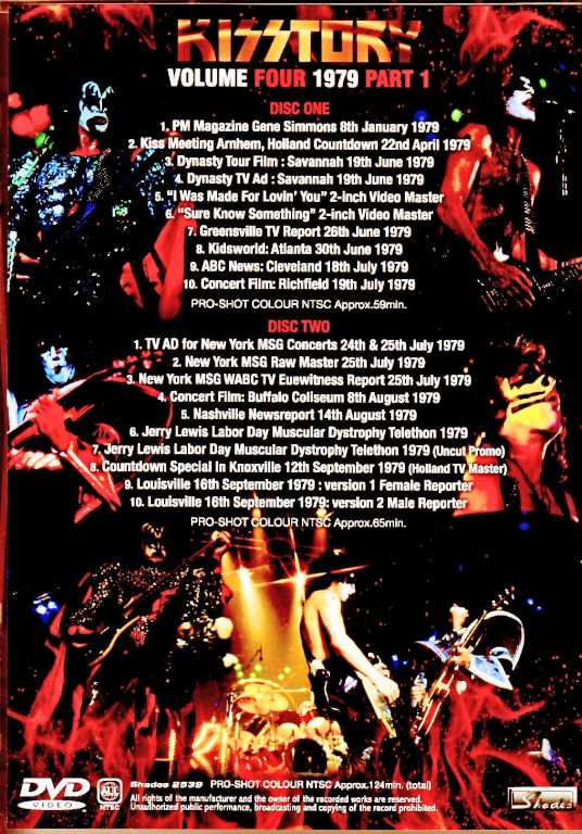 Following the October 2025 death of founding KISS guitarist Ace Frehley, this ultimate video compilation, Part 1 of the fourth installment, features two hours and four minutes of rare footage from the 1979 release of “Dynasty,” all masterfully compiled and compiled by an international KISS researcher using cutting-edge equipment. Due to the significant amount of footage remaining from the “Dynasty” era, which constitutes “Volume Four,” the compilation is divided into Parts 1 and 2, chronologically collating various rare footage, including TV appearances, tour performances, and live shows. Part 1 begins with the album promotional video, followed by tour reports and interviews, as well as fragmented but valuable pro-shot live footage. The footage from the New York and MSG concerts that year, both of which were leaked from TV broadcast sources, is of exceptional quality. This compilation also includes live 8mm footage from the band’s US tour and a charity TV program hosted by Jerry Lewis, making it a one-of-a-kind collection of footage that is too short to be released individually.It is a permanent compilation item that condenses a wide variety of records that are different from ordinary video works. Disc 1 : 1. PM Magazine Gene Simmons 8th January 1979 (* interview on Gene’s solo album.) 2. Kiss Meeting Arnhem, Holland Countdown 22nd April 1979 (* Master of Dutch TV Veronica’s Countdown on the very first KISS Convention ever) 3. Dynasty Tour Film : Savannah 19th June 1979 (Pro shot reel to promote the tour straight off the master tape) 4. Dynasty TV Ad : Savannah 19th June 1979 5. I Was Made For Lovin’ You 2” Master 6. Sure Know Something 2” Master (The videos for the two US singles from the Dynasty album directly of 2” video masters) 7. Greensville TV Report 26th June 1979 (Report with great footage off master) 8. Kidsworld: Atlanta 30th June 1979 ( KISS interview by a kid backstage in Atlanta.) 9. ABC News: Cleveland 18th July 1979 (Excellent off master VHS report on ABC’s 20/20 News on the KISS Business and the concert in Cleveland with superb footage.) 10. Concert Film: Richfield 19th July 1979 (Stunninh footage of the Cleveland concert.) Disc 2 : 1. TV AD for New York MSG Concerts 24th & 25th July 1979 (Off master VHS TV AD for the Return of Kiss) 2. New York MSG Raw Master 25th July 1979 (Raw TV master of all the footage shot at MSG including three complete songs.) 3. New York MSG WABC TV Euewitness Report 25th July 1979 (The actual TV broadcast of the previous footage) 4. Concert Film: Buffalo Coliseum 8th August 1979 (beautiful footage shot of the Buffalo show off master) 5. Nashville Newsreport 14th August 1979 (off master newsreel) 6. Jerry Lewis Labor Day Muscular Dystrophy Telethon (Kiss charity reel for Muscular Dustrophy) 7. Muscular Dystrophy Telethon (different charity reel) 8. Countdown Special In Knoxville 12th September 1979 :Holland TV Master (Off Master interview with the full band on Dutch TV’s Veronica’s Countdown) 9. Louisville 16th September 1979 : version 1 Female Reporter 10. Louisville 16th September 1979: version 2 Male Reporter (Both reels of the Louisville show off master with beautiful live footage) PRO-SHOT COLOR NTSC Approx.124min.