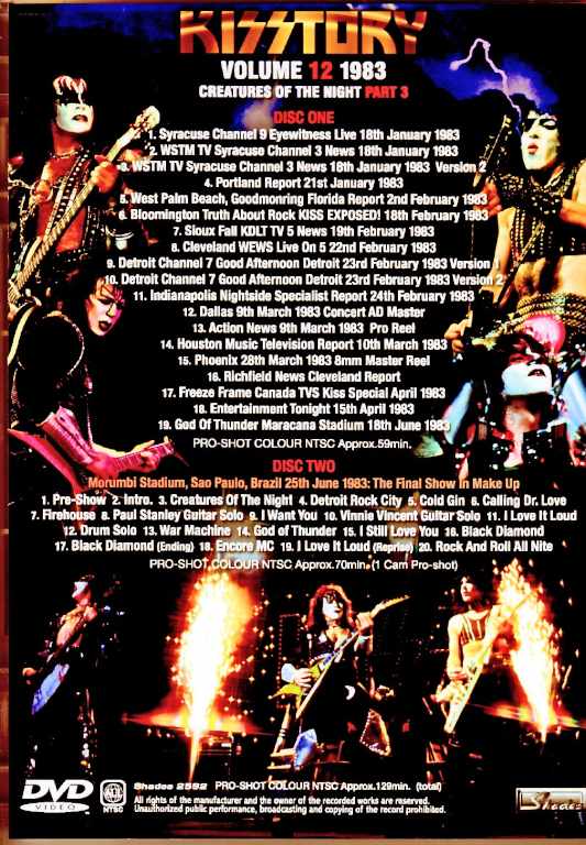 Here is Part 3 of the 12th installment of the ultimate compilation video, featuring 2 hours and 9 minutes of rare footage from the release of 1983’s “CREATURES OF THE NIGHT,” all from the best masters. This is the 12th installment of the rare series “KISSTORY,” compiled by an overseas KISS researcher who selected and edited a vast amount of video material using the latest equipment. This time, it brings together various rare videos related to “CREATURES OF THE NIGHT,” the final stage of the makeup era, including TV appearances and live performances, in almost chronological order. The biggest point here is Ace’s departure and Vinnie Vincent’s official joining, so it starts with a report and TV footage from the North American tour in January 1983, immediately after Vinnie joined, and then includes diverse footage from various performances, as well as pro-shot footage from their first South American tour. Disc 2 includes the June 25th performance in São Paulo, Brazil from that South American tour, which was the last stage of the makeup era, and the fact that it is almost a full recording, albeit with a single camera shot, is a major point. This collection brings together valuable records from a period that could be considered a turning point for the band. Disc 1 : 1. Syracuse Channel 9 Eyewitness Live 18th January 1983 2. WSTM TV Syracuse Channel 3 News 18th January 1983 3. WSTM TV Syracuse Channel 3 News 18th January 1983 Version 2 [Three different Syracuse concert segments off master VHS.] 4. Portland Report 21st January 1983 [Report off master of Portland show] 5. West Palm Beach, Goodmorning Florida Report 2nd February 1983 [Great West Palm Beach conxert news segment.] 6. Bloomington Truth About Rock KISS EXPOSED! 18th February 1983 [Superb footage from a religious organization trying to convince people Kiss were sent by Satan and they reveal this in this short but hilarious documentary] 7. Sioux Falls KDLT TV 5 News 19th February 1983 [Great news footage off master.] 8. Cleveland WEWS Live On 5 22nd February 1983 [Another news reel with live footage] 9. Detroit Channel 7 Good Afternoon Detroit 23rd February 1983 Version 1 10. Detroit Channel 7 Good Afternoon Detroit 23rd February 1983 Version 2 [Two different versions of news coverage on the Cobohall concert] 11. Indianapolis Nightside Specialist Report 24th February 1983 [Excellent off mastwr concert report.] 12. Dallas 9th March 1983 Concert AD Master [A superb tv commercial for the Dallas Kiss concert.] 13. Action News 9th March 1983 Pro Reel [Great uncut live footage shot for television, off master.] 14. Houston Music Television Report 10th March 1983 [Report off master of the Houston show.] 15. Phoenix 28th March 1983 8mm Master Reel [Superb 8mm reel of one of the final shows of the tour. Off master, perfect transfer.] 16. Richfield News Cleveland Report [Cleveland show report that aired months after the show.] 17. Freeze Frame Canada TVS Kiss Special April 1983 [The complete Paul and Gene Freeze Frame interview where they are still convinced Kiss in make up is the way to go and they will not unmask. Complete broadcast off master.] 18. Entertainment Tonight 15th April 1983 [Great footage on the tour.] 19. God Of Thunder Maracana Stadium 18th June 1983 [Off master News Footage from Globo TV News.] Disc 2 : 1. Pre-Show 2. Intro 3. Creatures of the Night 4. Detroit Rock City 5. Cold Gin 6. Calling Dr. Love 7. Firehouse 8. Guitar Solo (Paul Stanley) 9. I Want You 10. Guitar Solo (Vinnie Vincent) 11. I Love It Loud 12. Drum Solo 13. War Machine 14. Love Gun 15. Bass Solo 16. God of Thunder 17. I Still Love You 18. Black Diamond 19. I Love It Loud (Reprise) 20. Rock and Roll All Nite [at Morumbi Stadium, Sao Paulo, Brazil 25th June 1983 : The Final Show In Make Up] PRO-SHOT COLOR NTSC Approx.129min.