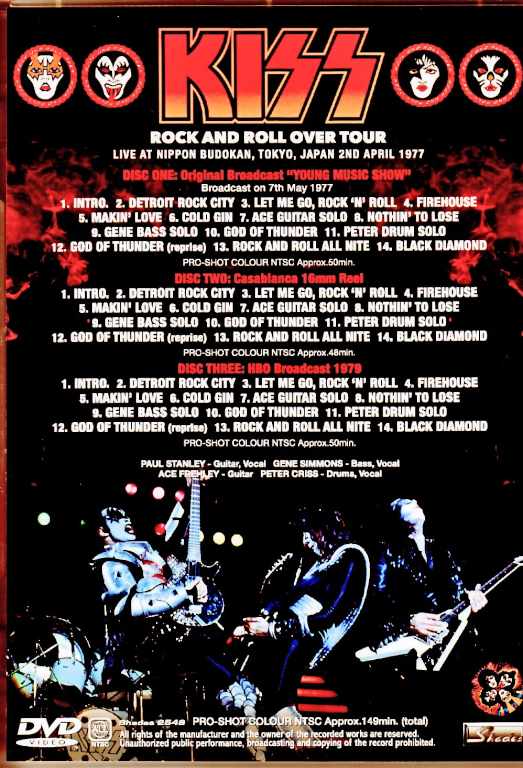 The now-legendary 1977 KISS debut in Japan was televised at the time, and numerous video sources based on that footage have circulated. Now, we present a set of three different best masters. First, the Japan tour consisted of nine shows in total, and for their first visit to Japan, they received exceptional treatment for their first live performance in Japan, including four shows at the Nippon Budokan (including both daytime and evening performances). Of these, only a few songs from the daytime and evening performances on April 2nd were televised, and this set compiles three of the best masters from that broadcast source. Disc 1 is the most familiar original broadcast version from “Young Music Show,” recorded directly from a video copy recorded in Japan at the time, and contains 50 minutes of footage. Disc 2 is the theatrical 16mm film, commonly known as “KISS LIVE IN JAPAN,” the version distributed by the record company to Japanese movie theaters at the time, and also distributed to other countries for promotional purposes, recorded for 48 minutes. Furthermore, disc 3 contains the main attraction of this title: the original HBO broadcast version from the United States, boasting ultimate visual beauty. This 50-minute version is taken from the best-quality master of the footage broadcast by a local New York cable TV station in 1979. Note that there are subtle differences between each version, and each has its own unique image quality, making it a must-have item for longtime fans, especially considering its high historical value. Disc 1 : 1. Intro 2. Detroit Rock City 3. Let Me Go, Rock ‘N’ Roll 4. Firehouse 5. Makin’ Love 6. Cold Gin 7. Ace Solo 8. Nothin’ To Lose 9. Gene Solo 10. God Of Thunder 11. Peter Solo 12. God Of Thunder (reprise) 13. Rock And Roll All Nite 14. Black DiamondLive at Budokan, Tokyo, Japan 2nd April 1977 : Original Broadcast / Young Music Show Broadcast on 7th May 1977 : PRO-SHOT COLOUR NTSC Approx.50min Disc 2 : 1. Intro 2. Detroit Rock City 3. Let Me Go, Rock ‘N’ Roll 4. Firehouse 5. Makin’ Love 6. Cold Gin 7. Ace Solo 8. Nothin’ To Lose 9. Gene Solo 10. God Of Thunder 11. Peter Solo 12. God Of Thunder (reprise) 13. Rock And Roll All Nite 14. Black Diamond Live at Budokan, Tokyo, Japan 2nd April 1977 : Original Broadcast / Casablanca 16mm Reel : PRO-SHOT COLOR NTSC Approx.48min Disc 3 : 1. Intro 2. Detroit Rock City 3. Let Me Go, Rock ‘N’ Roll 4. Firehouse 5. Makin’ Love 6. Cold Gin 7. Ace Solo 8. Nothin’ To Lose 9. Gene Solo 10. God Of Thunder 11. Peter Solo 12. God Of Thunder (reprise) 13. Rock And Roll All Nite 14. Black Diamond Live at Budokan, Tokyo, Japan 2nd April 1977 / HBO Broadcast 1979 : PRO-SHOT COLOUR NTSC Approx.50min