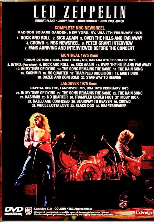 This compilation features digitized, rare color 16mm film footage from the 1975 North American tour, primarily focusing on the February 7th Madison Square Garden performance in New York, totaling 1 hour and 34 minutes. The main MSG performance was filmed by NBC at the time, and while it’s not exactly professional footage, being a one-camera documentary for the news program “NBC Newsreel,” the raw, unedited 16mm film footage, complete with a time counter, captures fragments of the live performance with incredible clarity, far superior in quality to the 8mm film prevalent at the time. However, despite being valuable newly discovered 16mm film, the total running time is only about 21 minutes, so footage from the February 6th Canada, Montreal, and February 10th Landbar performances has been added in color 8mm film format. The footage from the 6th, in particular, was unearthed from the video collection of a professional cameraman named Jim Kelly. Although it’s fragmented footage for 8mm, which is known for its short shooting times, it’s a lengthy 50 minutes in total, and it also captures the entire stage well in the Lundbar performance. All of this is one of the few remaining live video records and a must-have item for core Led Zeppelin fans. 1. Rock And Roll 2. Sick Again 3. Over The Hills And Far Away 4. Crowd (before encores) 5. NBC Newsreel 6. Peter Grant Interview 7. Fans Arriving And Interviewed Before The Concert MSG 1975 2ND NIGHT COMPLETE NBC NEWSREEL : at Madison Square Garden, NYC, NY, USA 7th February 19758. Intro (Pre-show) 9. Rock And Roll 10. Sick Again 11. Over The Hills And Far Away 12. In My Time Of Dying 13. The Song Remains The Same 14. The Rain Song 15. Kashmir 16. No Quarter 17. Trampled Underfoot 18. Moby Dick 19. Dazed And Confused 20. Stairway To Heaven MONTREAL 1975 8mm : at Forum de Montreal, Montreal, QC, Canada 6th February 1975 21. In My Time Of Dying 22. The Song Remains The Same 23. The Rain Song 24. Kashmir 25. No Quarter 26. Trampled Under Foot 27. Moby Dick 28. Dazed And Confused 29. Stairway To Heaven 30. Crowd (before encores) 31. Whole Lotta Love 32. Black Dog 33. Heartbreaker LANDOVER 1975 8mm : at Capital Center, Landover, MD, USA 10th February 1975 COLOR NTSC Approx.94min.