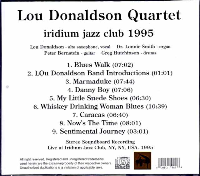 This superb stereo soundboard recording is a rare live performance by Lou Donaldson, a virtuoso musician who has been active since the dawn of hard bop and has left numerous works for Blue Note. The performance is by a quartet consisting of Dr. Lonnie Smith, a leading jazz Hammond organist, Peter Bernstein, a guitarist who had just made his debut at the time, and Gregory Hutchinson, a drummer who had come to prominence with the Roy Hargrove Quintet. You can enjoy the bluesy performance reminiscent of ’60s soul jazz with superb sound, including songs from his new albums at the time such as “Danny Boy” and “Sentimental Journey”. Live at Iridium Jazz Club, NY, NY, USA. 1995 1. Blues Walk (07:02) 2. Lu Donaldson Band Introductions (01:01) 3. Marmaduke (07:44) 4. Danny Boy (07:06) 5. My Little Suede Shoes (06:30) 6. Whiskey Drinking Woman Blues (10:39) 7. Caracas (06:40) 8. Now’s The Time (08:01) 9. Sentimental Journey (03:01) Lou Donaldson – alto saxophone, vocal Dr. Lonnie Smith – organ Peter Bernstein – guitar Greg Hutchinson – drums