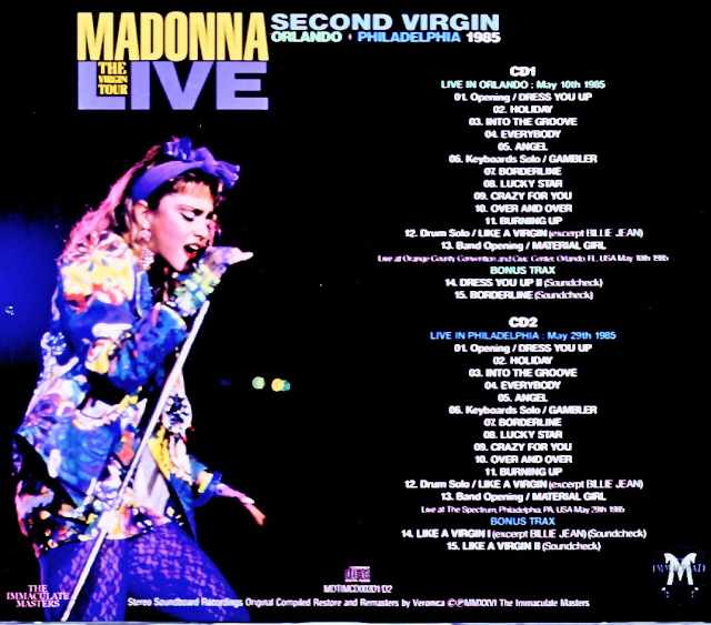 As the second installment of live archives documenting the 1985 “Virgin Tour,” this 2CD set features full recordings of each US performance in stereo soundboard format, along with related recordings, all newly edited for 2026. This title is the second anthology of the “Virgin Tour,” Madonna’s first concert tour following her breakout success with “Like a Virgin,” and includes full recordings of the May 10th Florida, Orlando performance and the May 29th Philadelphia performance, all in stereo soundboard format. While the Detroit performance from this tour was later released as a video, it was an edited version with three songs missing, and the full version is currently virtually unavailable officially. Moreover, these live archives feature high-quality stereo soundboard recordings, unlike most previous recordings which were incomplete or degraded mono recordings, as these are the best quality recordings restored in 2026 from low-generation masters. The live setlist includes hits from their first two albums, as well as tracks from the movie “Vision Quest,” such as “Crazy for You” and “Gambler,” many of which are no longer included in their setlists, making it truly representative of that era. The Orlando performance is recorded from a newly leaked, complete stereo soundboard master, and the Philadelphia performance, which took place after the Detroit performance that was filmed, is worth checking out as the stage management and performance are tighter compared to the earlier part of the tour. In addition, bonus tracks such as soundcheck and tour rehearsal recordings are included after each performance, making this limited collector’s edition a must-have for all fans, along with items scheduled for future release. Disc 1 : 01. Opening / DRESS YOU UP/02. HOLIDAY/03. INTO THE GROOVE/04. EVERYBODY/05. ANGEL/06. Keyboards Solo / GAMBLER/07. BORDERLINE/08. LUCKYSTAR/09. CRAZY FOR YOU/10. OVER AND OVER/11. BURNING UP/12. Drum Solo / LIKE A VIRGIN (excerpt BILLIE JEAN)/13. Band Opening / MATERIAL GIRL/14. DRESS YOU UP II (Soundcheck)/15. BORDERLINE (Soundcheck) Live at Orange County Convention and Civic Center, Orlando, FL, USA May 10th 1985 Disc 2 : 01. Opening / DRESS YOU UP/02. HOLIDAY/03. INTO THE GROOVE/04. EVERYBODY/05. ANGEL/06. Keyboards Solo / GAMBLER/07. BORDERLINE/08. LUCKY STAR 09. CRAZY FOR YOU/10. OVER AND OVER/11. BURNING UP/12. Drum Solo / LIKE A VIRGIN (excerpt BILLIE JEAN)/13. Band Opening / MATERIAL GIRL / 14. LIKE A VIRGIN I (excerpt BILLIE JEAN) (Soundcheck)/15. LIKE A VIRGIN II (Soundcheck) Live at The Spectrum, Philadelphia, PA, USA May 29th 1985 Original Remasters and Restoration
