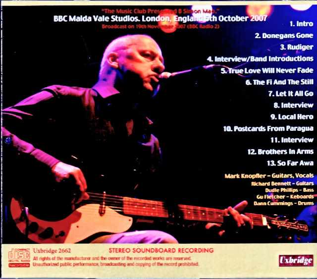 Mark Knopfler’s 2007 album, “KILL TO GET CRIMSON,” reached the UK Top 10, marking his fourth album and continuing to exert a powerful presence on the scene. Now, a soundboard album has arrived that will immerse you in that live performance. This work is dated October 5, 2007, in London. It’s a stereo soundboard recording taken at BBC’s Maida Vale Studios. Speaking of the “KILL TO GET CRIMSON” era, the classic pro-shot “AVO SESSION 2007” is a classic, but of course (?) this is a different performance. To understand the situation, let’s start by looking back at the band’s activities at the time. 2007 – June 3: Hay-on-Wye performance; September 10: Berlin performance (“KILL TO GET CRIMSON” released on September 17); September 20-October 5: Europe #1 (3 shows) ←★here★; November 12-19: Europe #2 (2 shows) ←※AVOSESSION 2007; 2008 – March 29-June 15: Europe #3 (64 shows); June 24-July 31: North America (31 shows). This is Mark Knopfler in 2007/2008. “KILL TO GET CRIMSON” was released in the fall of 2007, but the world tour didn’t begin until about six months later. 2007 was dominated by showcase-style promotion. This video is a performance for BBC broadcast, about three weeks after the album’s release. This is a long-standing staple of the prestigious BBC FM broadcast, and this CD release is a masterpiece from that best master. Indeed, its sound is of official masterpiece quality. It’s not simply a “high-quality broadcast,” but a masterpiece-level quality that would be talked about even if it were released as an official regular release. The recording and mix are exquisite, with every note clearly recorded, from the moment it first begins to fade. It’s so delicate you can almost feel the vibrations of the instrument’s body, and so realistic you can almost feel the room temperature in the studio. If we were to compare it to an official release, it’s like a high-quality CD, focused on accurately restoring the sound of the master tape. Such high-quality audio-grade, superb sound portrays a special performance that’s completely different from a regular concert. As mentioned above, the promo tour masterpiece “AVO SESSION 2007” is also a classic, so let’s compare and organize them. KILL TO GET CRIMSON (3 songs), True Love Will Never Fade / The Fizzy And The Still (*), Let It All Go (*), Others (6 songs), BROTHERS IN ARMS: Brothers In Arms / So Far Away (★), SHANGRI-LA: Donegan’s Gone / Postcards From Paraguay, Others: Rudiger / Going Home: Theme of the Local Hero (★) *Note: “★” indicates songs that were not included in the pro-shot masterpiece “AVO SESSION 2007.” “*” indicates songs exclusive to the promo tour. …And so it goes. It seems there was an audience at the venue, but it was only a special performance for the show. There were also interviews with personalities between songs (3 times). The set was exclusive to the promo tour, with the new songs from “KILL TO GET CRIMSON” at the core. Among these, “The Fizzy and the Still” and “Let It All Go” are exclusive tracks that were not even performed on the main “KILL TO GET CRIMSON Tour” the following year. This disc allows you to enjoy a special performance for a program different from the regular tour with official, classic-quality sound. This is an exceptional studio live album, so much so that it should have been released as an official deluxe edition set with “KILL TO GET CRIMSON.” This stereo soundboard recording was made in London on October 5, 2007. This was a radio program that appeared shortly after the release of “KILL TO GET CRIMSON,” and the CD sound from the best master recording is a masterpiece even by the standards of official regular works. This studio live album also boasts exclusive tracks such as “The Fizzy and the Still” and “Let It All Go,” which were not even performed on the main “KILL TO GET CRIMSON Tour.” BBC Maida Vale Studios. London, England 5th October 2007 (59:21) 01. Intro 02. Donegans Gone 03. Rudiger 04. interview / Band Introductions 05. True Love Will Never Fade 06. The Fizzy And The Still 07. Let It All Go 08. interview 09. Local Hero 10. Postcards From Paraguay 11. interview 12. Brothers In Arms 13. So Far Away Mark Knopfler – Guitars, Vocals Richard Bennett – Guitars Dudley Phillips – Bass Guy Fletcher – Keyboards Danny Cummings – Drums STEREO SOUNDBOARD RECORDING