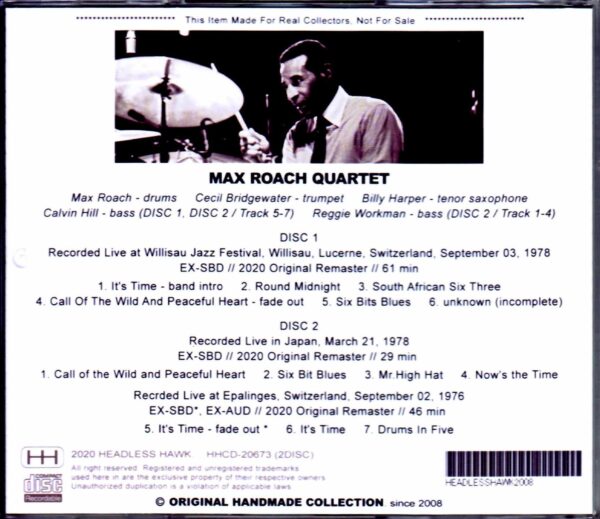 Roach, who had perfected modern drumming and reigned as a pioneer and leading figure in modern jazz, welcomed the young elite who formed the core of the Sadmer Orchestra, which was at the cutting edge of the jazz world in the 1970s. , a spectacular three-part live show featuring passionate performances that are a precursor to modern jazz tradition! ! Immediately after the formation of the quartet, the Max Roach Quartet performed in Epalanges, Switzerland on September 2, 1976, followed by a performance in Japan in 1977 and then on March 21st in 1978, and a performance in Japan on September 3 of the same year. A super hot 2-disc set that records all 3 rare performances at the Willisau Jazz Festival in Japan and Switzerland on the label’s own carefully mastered super high-quality soundboard (part of the audience). is now in stock! ! All three performances are worth listening to, but in 1976, “It’s Time” by Max, which spans over 35 minutes, is powerful. The studio recording is included on the Impulse masterpiece, but in this live performance, there was no orchestra or chorus or other unnecessary elements, and the four members played straight one shot, creating a sense of tension as they performed this masterpiece. This is a passionate performance with the longest performance time. By the way, the bassist in 1976 was Reggie Workman. The 1978 Japan performance boasts more fulfilling content than the last year’s live that was officially released. Another performance in 1978 was an excellent performance of “Round Midnight,” which featured an innovative two-pipe structure. The front two people are wonderful throughout. Harper’s tenor, which is heavily influenced by Coltrane, is characterized by its simple and melodious nature, and although there are free moments, he never gets tired of it because he moves on to the next development at a moderate length. I would like to recommend Harper as a suitable player as an introduction to Coltrane-type tenor. And Cecil’s trumpet is strong again. Listening to his amazing play, where he blows out complex phrases at extremely high speeds, it feels like the Brownies of the 50’s heyday have come back to life. Furthermore, the ensemble created by Harper and Cecil, who had been collaborating with the Sadmer Orchestra with outstanding compatibility until just before joining this quartet, is so exquisite that it is difficult to describe in words. Also, bassist Calvin Hill, who joined Roach in 1978 and continued to work with Roach in the 1980s along with Cecil, has a very cool bass. It’s great to see that they’ve evolved since they were a regular quartet formed by McCoy Tyner in 1971, when they played fiercely in combination with drummer Alphonse Mouzane. Come to think of it, this quartet came to Japan in 1972. The Japanese performance at this time is also available with the highest quality sound board! Max Roach – Drums Cecil Bridgewater – Trumpet Billy Harper – Tenor Saxophone Calvin Hill – Bass (Disc 1,Disc2 / Track 5-7) Reggie Workman – Bass (Disc 2 / Track1-4) Disc 1 Live at Willisau Jazz Festival,Willisau, Lucerne,Switzerland September.03.1978 EX – SBD 2020 Original Remaster 61 min 1. It’s Time – Band intro 2. Round Midnight 3. South African Six Three 4. Call of the Wild and Peaceful Heart – fade out 5. Six Bits Blues 6. Unknown (incomplete) Disc 2 Live at Japan March.21.1978 EX – SBD 2020 Original Remaster 29 min 1. Call of the Wild and Peaceful Heart 2. Six Bit Blues 3. Mr. Hight Hat 4. Now’s the Time Live at Epalinges,Switzerland September.02.1976 EX – ABD EX – AUD 2020 Original Remaster 46 min 5. It’s Time – fade Out 6. It’s Time 7. Drums in Five