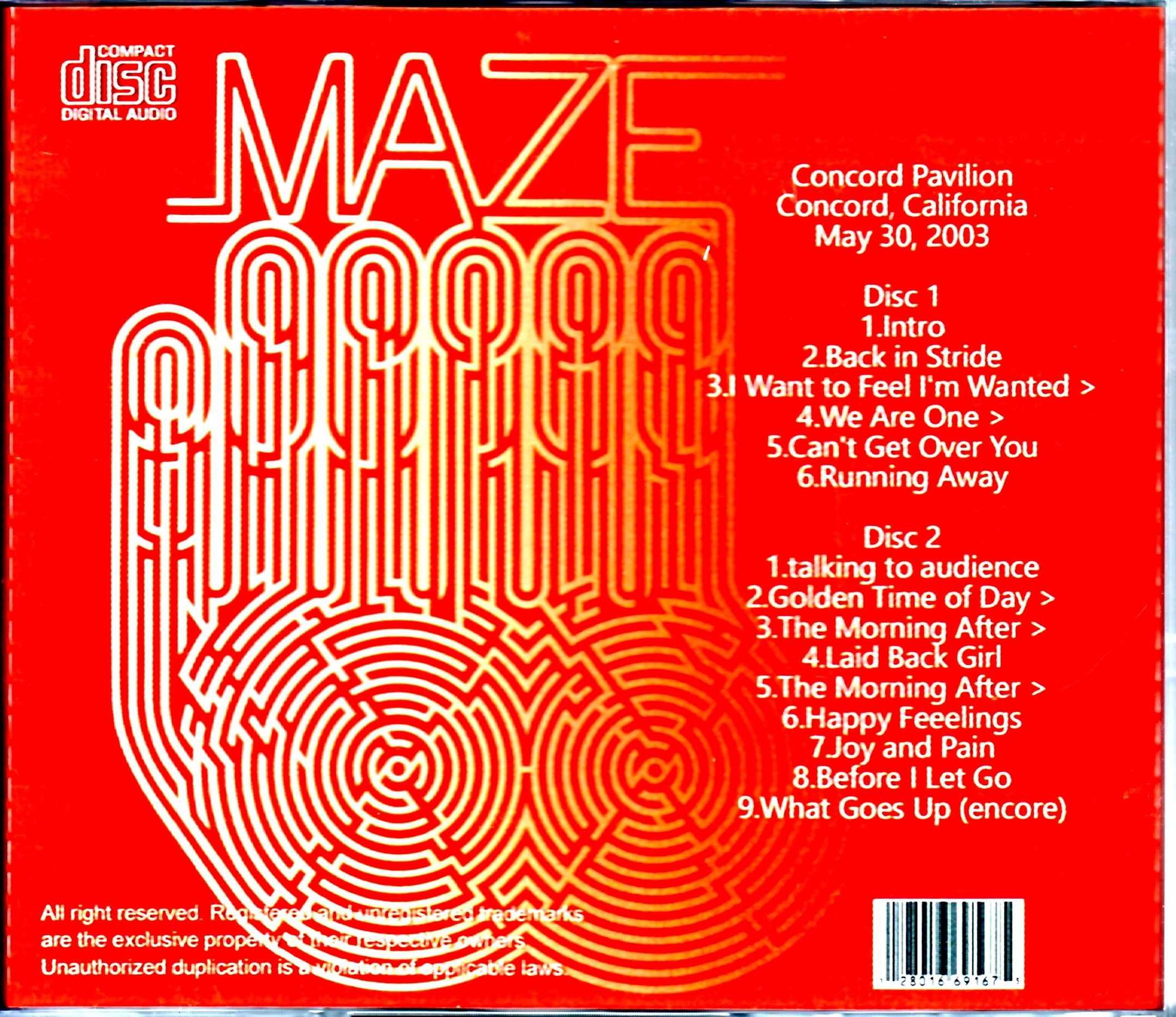Recorded in soundboard-quality high-quality sound that brings the audience to the 2003 Concord live performance with the highest sense of realism. The live performance by Maze is as good as its reputation, and the hit songs are covered in 2 CDRs. Enjoy the raw sound and unedited charm that is different from the official live album. Concord Pavilion Concord, California May 30, 2003 Disc 1 1.Intro 2.Back in Stride 3.I Want to Feel I’m Wanted > 4.We Are One > 5.Can’t Get Over You 6.Running Away Disc 2 1.talking to audience 2.Golden Time of Day > 3.The Morning After > 4.Laid Back Girl 5.The Morning After > 6.Happy Feelings 7.Joy and Pain 8.Before I Let Go 9.What Goes Up ( encore)
