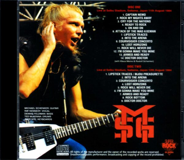 “SUPER ROCK ’84 IN JAPAN” revives the precious official video of M.S.G.’s third generation singer, Ray Kennedy, in the world’s highest quality. It is truly a decision board among decision boards, but unfortunately it is incomplete recording and a dynamic replacement. That being said, he preserved the Ray Kennedy era in the best possible way, but since he is a legend, I am also curious about his true form. Therefore, we have prepared an audience album for the two days at Seibu Stadium. This work is the same master as those previously released as “SUPER ROCK ’84 TOKYO DAY 1” and “SUPER ROCK ’84 TOKYO DAY 2”, with “August 11th” on Disc 1 and “August 12th” on Disc 2. ” is included. Of course, it is a completely original master using the cassette given by the recording person himself, and was recorded with the same taper and equipment on both days. Currently, the Miracle Man recordings “TOKYO FIRST DAY” and “TOKYO SECOND DAY” with a similar concept are on CD, but they are recorded separately. The first half of the show on the second day was not recorded, and it was a recording that missed out on CD due to the major drawback of starting from “Lipstick Traces,” but the sound itself is as good as the Miracle Man recording. In fact, some customers say they like it better than the Miracle Man recording. After all, the biggest highlight is Disc 1, which contains the first day. The only thing that has been made official is the scene where Rudolf Schenker and Klaus Meine jump in in “Doctor Doctor,” so almost the entire movie is a separate live performance. Starting with “Ready To Rock,” “Attack Of The Mad Axeman,” and “Rock Will Never Die,” which were cut in the official video, and even the surprising MC who says “Moshimoshi! Are you ready?” at the beginning of “Cry For The Nations,” the complete performance includes You can enjoy it with great sound. Ray’s performance was full of impact even in the official video, but the 100% real version is even more amazing. The husky voice quality is reminiscent of Kevin Dubrow or Dee Snider, but it’s hard to describe the lyrics that can’t be memorized, the sloppy delivery and MC who doesn’t understand the band’s image at all. His destructive power is tremendous even with just the voice without any costume or action. Disc 2 of “August 12th”, which is the same as the video, allows you to enjoy the charm without replacement. Although the first half is missing, the sound is better than Disc 1 and has ideal high-quality sound. Ray’s voice disappears here, without even allowing us to hear his uncontrollable behavior. The high-key “I’m Gonna Make You Mine” makes you think, “Oh, you can sing!”, but in the middle of the song, you completely lose track of the progress, and in “Armed And Ready”, it’s no longer improvised lyrics, but scatting. situation. The 12-minute “Rock Bottom” is where Michael’s high tension explodes, making it hard to tell whether he’s desperately trying to rebuild his stage or whether he’s giving up on himself. Although it was cut out from the official video, it is an amazing take with a great performance that seems to be shouting, “If I have a solo, that’s fine!” The last song, “Doctor Doctor,” runs out of tape after about 3 minutes and 15 seconds. After all, it is a difficult recording to press, but it is also a sound that is too unfortunate to be forgotten. The last night of “THE MICHAEL SCHENKER GROUP” recorded by one taper, and the truth about the turning point of the Schenker brothers combined with the SCORPIONS edition. Please enjoy it to the fullest! Live at Seibu Stadium, Saitama, Japan 11th & 12th August 1984 TRULY AMAZING/PERFECT SOUND(from Original Masters) Disc 1 Live at Seibu Stadium, Saitama, Japan 11th August 1984 1. Captain Nemo 2. Rock My Nights Away 3. Cry For The Nations 4. Ready To Rock 5. On And On 6. Attack Of The Mad Axeman 7. Lipstick Traces 8. Into The Arena 9. Courvoisier Concerto 10. Lost Horizons 11. Rock Will Never Die 12. I’m Gonna Make You Mine 13. Armed And Ready 14. Doctor Doctor (with Klaus Meine & Rudolf Schenker) Disc 2 Live at Seibu Stadium, Saitama, Japan 12th August 1984 1. Lipstick Traces/Bijou Preasurette 2. Into The Arena 3. Courvoisier Concerto 4. Lost Horizons 5. Rock Will Never Die 6. I’m Gonna Make You Mine 7. Armed And Ready 8. Rock Bottom 9. Doctor Doctor Michael Schenker – Guitar Ray Kennedy – Vocal Dennis Feldman – Bass Ted McKenna – Drums Andy Nye – Keyboards