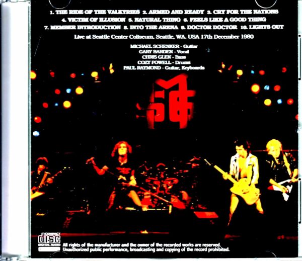 From the American tour from November to December 1980 that MICHAEL SCHENKER GROUP conducted after the release of their 1st album “THE MICHAEL SCHENKER GROUP”, the performance in Seattle, Washington on December 17th was performed using the newly released Audience Master. The release has been decided. The sound source from this 1980 American tour is known as the standard sound board sound source owned by Cozy Powell, but there are very few titles recorded by the audience, so this release is news that has attracted a lot of attention from fans. Masu! This sound source, which is thought to have been produced directly from the master, has excellent brightness and freshness of sound, and is comparable to live performances in England and Japan from the same period. However, there were some unstable points, such as a slight bias toward the left channel, and it was also true that the sound was somewhat distorted. Therefore, in making this disc, we corrected the bias through thorough remastering, and also eliminated many noises and distortions. Regarding the ease of listening, this work has made great improvements in terms of sound quality, so much so that it can be said that it is a problem before comparison with the same-day sound source known among traders and on the Internet. The live performance started with the opening BGM “The Ride Of The Valkyries”, just like the performance in Japan the following year. From the intro, a solemn atmosphere dominated the entire venue, and it was clear that the excitement of the audience was increasing greatly. The moment “Armed And Ready” started from the band introduction announcement on the venue side, the excitement sparked all at once, and the live curtain was cut off with the highest excitement. The sound image of the stage sound rushing all at once with high sound pressure is incredibly powerful. Although there is a certain sense of separation, the play of the core members of M.S.G. in this formation, such as Michael’s guitar, Gary Burden’s vocals, and Cozy’s drums, can be heard surprisingly well. From the opening, the fans at the venue let out loud cheers and were delighted when they heard the three songs from their 1st album, “Cry For The Nations” and “Victim Of Illusion”! In the middle of the show, the UFO number “Natural Thing” is played with an edgy guitar, entertaining the listeners with its outstanding rhythm. Paul Raymond’s keyboard also makes the song feel lively, and this is the part that can be said to be a good place to listen. Don’t miss listening to “Feels Like A Good Thing”, where Cozy’s drums carve a straight and hard intro that is different from the original Simon Phillips. After playing the same song, Paul Raymond will introduce the members, and the live will move on to the highlight “Into The Arena”! “Into The Arena” that you can listen to here is very powerful and can be said to be a take that allows you to fully enjoy the charm of live tape. Furthermore, “Doctor Doctor” and “Lights Out”, which seem to be folding, are played to a full satisfaction, and the live ends with great excitement! As mentioned above, the soundboard sound sources derived from “Cozy Tapes” from this period of live performances exist as definitive 2-disc sets. In “RETURN OF THE FLYING ARROW” you can listen to the performance in Pennsylvania in November, and in “FLYING OVER WEST” you can listen to the performance in Los Angeles on December 22nd, which was held 5 days after the original sound source, in the best sound. . However, these two titles are unfortunately incomplete recordings with some parts missing, and in terms of listening to the live performance at that time from the opening to the end of the show, this work of audience recording is clearly superior. (It is also worth noting that the set list changes frequently depending on the day). A surprising title packaged with 40 minutes of must-listen for M.S.G. enthusiasts. Live at Seattle Center Coliseum, Seattle, WA. USA 17th December 1980 TRULY AMAZING SOUND 1. The Ride Of The Valkyries 2. Armed And Ready 3. Cry For The Nations 4. Victim Of Illusion 5. Natural Thing 6. Feels Like A Good Thing 7. Member Introduction 8. Into The Arena 9. Doctor Doctor 10. Lights Out Michael Schenker – Guitar Gary Barden – Vocal Chris Glen – Bass Cozy Powell – Drums Paul Raymond – Keyboards