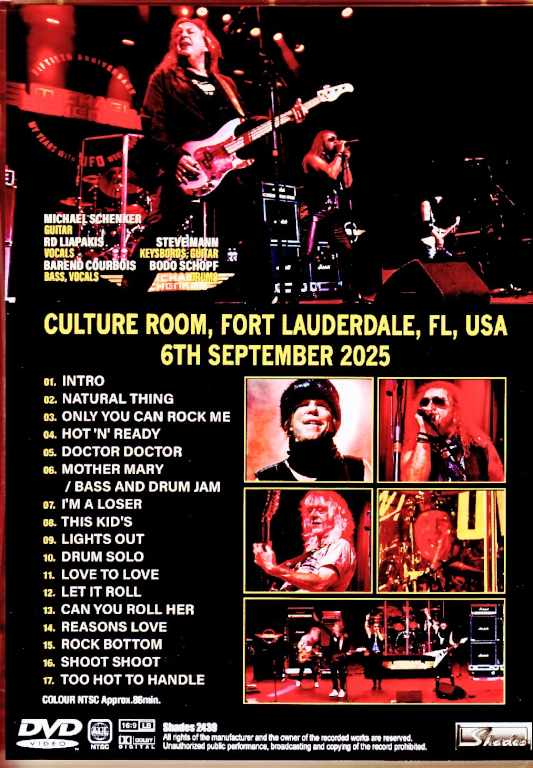 With additional dates confirmed for the Japan tour, Michael Schenker is suddenly feeling more energized. This latest, powerful footage further fuels those expectations. This work was filmed at the Fort Lauderdale performance on September 6, 2025. It’s a front-row audience shot. While the greatest feature of this work is the experience of monopolizing the show from the ultimate special seat, another thing we shouldn’t forget is the singer. On the current “MY YEARS WITH UFO Tour,” Eric Gronwall and RD Liapakis alternate between performance locations. To understand the current situation, let’s start with a bird’s-eye view of their ongoing activities. 2025 March 11th + 14th: MOR Cruise (2 shows) (Robin McCauley replaced by Eric Gronwall) “MY YEARS WITH UFO Tour” April 9th - May 15th: Europe #1 (28 shows) ← *BARCELONA 2025 etc. June 28th – August 23rd: Europe #2 (9 shows) ← *WACKEN 2025 (Gronwall replaced by RD Liapakis) September 5th – October 19th: North America (30 shows) ← ★Here★ 2026 (Liapakis replaced by Gronwall) January 28-29: Japan (3 shows) (Gronwall replaced by Liapakis?) February 18-March 22: Europe #3 (22 shows) April 7-13: Germany (7 shows) This is the 2025/2026 schedule announced so far. The Japan show has been added, and a subsequent European tour has also been announced. Things are finally starting to look like a full-scale world tour. The current official singer is Eric Gronwall, but last year he temporarily withdrew from the tour due to a family illness. RD Liapakis took over. Things were going well until Gronwall returned to the tour safely shortly after, but then things got complicated. It was announced that Liapakis will front the band for the currently ongoing North American leg and next year’s Europe #3 leg. For now, Gronwall is scheduled to sing for the Japan show, but it’s becoming increasingly unclear who the official singer will be. Meanwhile, the Fort Lauderdale performance marked the second show of the ongoing North American leg. It marked the first show since the tour resumed with RD Liapakis. This vacuum-packed footage offers a powerful, front-row experience of the full show. Being in the front row is impressive enough, but the seating on either side is also exceptional, sitting exactly between the singer and Michael. The view, free of other audience members, creates an otherworldly feeling of “just you and the band.” And because it’s a club-sized venue, it feels like you could touch him if you let your eyes wander…or rather, you can experience a sense of intimacy, like jumping right into his arms. It’s so close that Michael might even yell, “You’re getting too close!” From this exceptional seat, you can experience a UFO paradise transformed by Liapakis’s singing voice. The tracklist itself remains the same as the European edition, but there are some minor changes. Let’s summarize the details here: Force It (4 songs), Mother Mary, This Kid’s, Let It Roll, Shoot Shoot, No Heavy Petting (4 songs), Natural Thing, I’m A Loser, Can You Roll Her, Reasons Love, and others (7 songs). New Murderous Intent: Lights Out, Love To Love, Too Hot To Handle, and others: Only You Can Rock Me, Hot ‘N’ Ready, Doctor Doctor, Rock Bottom… While Europe featured solo moments based on instrumental tracks like “Lipstick Traces,” these were omitted in North America. There were no new songs, much talked about in “WACKEN 2025,” and the show was a careful listen, focusing on each song. While their long-awaited return to Nippon Budokan is much talked about for their Japan tour next year, this album is the complete opposite: a club gig. This film is a shocking video that lets you experience UFO Paradise from the front row. It’s the luxury of sharing space with the guitar god in a closed-door atmosphere where you can almost feel his breath. This is a front-row audience shot from the “September 6, 2025 Fort Lauderdale performance.” Sitting in the front row, exactly between the singer and Michael, you’re completely surrounded by the stage, with no other audience members visible, giving you the otherworldly feeling of “just you and the band.” Experience UFO Paradise from a super-premium seat, with RD Liapakis singing with a powerful voice reminiscent of Mark Tornillo. Culture Room, Fort Lauderdale, FL, USA 6th September 2025 AMAZING SHOT!!!!!!!!!!!! 1. Intro 2. Natural Thing 3. Only You Can Rock Me 4. Hot ‘N’ Ready 5. Doctor Doctor 6. Mother Mary / Bass And Drum Jam 7. I’m A Loser 8. This Kid’s 9. Lights Out 10. Drum Solo 11. Love To Love 12. Let It Roll (with Mississippi Queen) 13. Can You Roll Her 14. Reasons Love 15. Rock Bottoms) 16. Shoot Shoot 17. Too Hot To Handle COLOR NTSC Approx.86min. Michael Schenker – Guitar RD Liapakis – Vocals Barend Courbois – Bass Bodo Schopf – Drums Steve Mann – Keyboards & Guitar