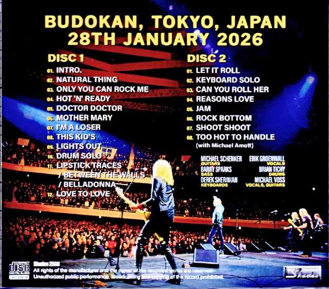 This release features a full 1 hour and 47 minute recording of the January 28th Tokyo Budokan concert, the highlight of the “MY YEARS WITH UFO” Japan tour, which consisted entirely of UFO songs in 2026, taken from a digital audience master released by the taper. Michael’s guitar and vocals are recorded beautifully and flawlessly, and the band sound alone is of such high quality that you might think it’s a soundboard recording. This all-UFO set, which can finally be seen in Japan, is a UFO best-of live performance that includes an instrumental medley, just like the performances around the world in the previous years. However, the lineup for this Japanese show has been completely revamped, with former Skid Row member Eric Grönwall returning on vocals, former Dream Theater member Derek Sherinian on keyboards, and former Whitesnake member Brian Tichy on drums. The presence of these seasoned veterans is a major point of interest, as it is a lineup exclusive to Japan. All three shows during this visit to Japan featured the same setlist, including numbers from “Force It,” “No Heavy Petting,” and “A New Intent to Kill,” as well as an instrumental medley, and of course, “Only You Can Rock Me,” “Doctor Doctor,” and “Rock Bottom”—the 70s Michael of UFO truly came to Japan. The fact that this was his first performance at the Budokan in 38 years also generated a lot of buzz, and on this particular night, during the final encore song “Too Hot To Handle,” Arch Enemy’s Michael Amott suddenly appeared and the two performed a guitar duet—a surprise only possible at the Budokan. It is said that he came to Japan to see the Budokan performance and joined in at the last minute, and this limited-edition memorial item from this visit perfectly recreates that special night. Live at Budokan, Tokyo, Japan 28th January 2026 : from Original Masters Disc 1 : 1. Intro. 2. Natural Thing 3. Only You Can Rock Me 4. Hot ‘n’ Ready 5. Doctor Doctor 6. Mother Mary 7. I’m a Loser 8. This Kid’s 9. Lights Out 10. Drum Solo 11. Lipstick Traces / Between the Walls / Belladonna 12. Love to Love Disc 2 : 1. Let It Roll 2. Keyboard Solo 3. Can You Roll Her 4. Reasons Love 5. Jam 6. Rock Bottom 7. Shoot Shoot 8. Too Hot to Handle (with Michael Amott) Michael Schenker – Guitars / Erik Groenwall – Vocals / Barry Sparks – Bass / Brian Tichy – Drums / Derek Sherinian – Keyboards / Michael Voss – Vocals, Guitars